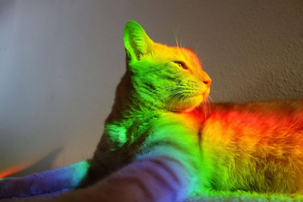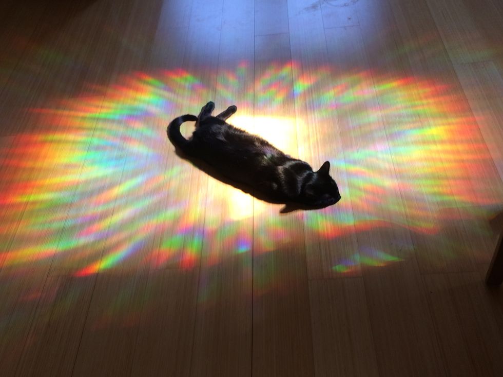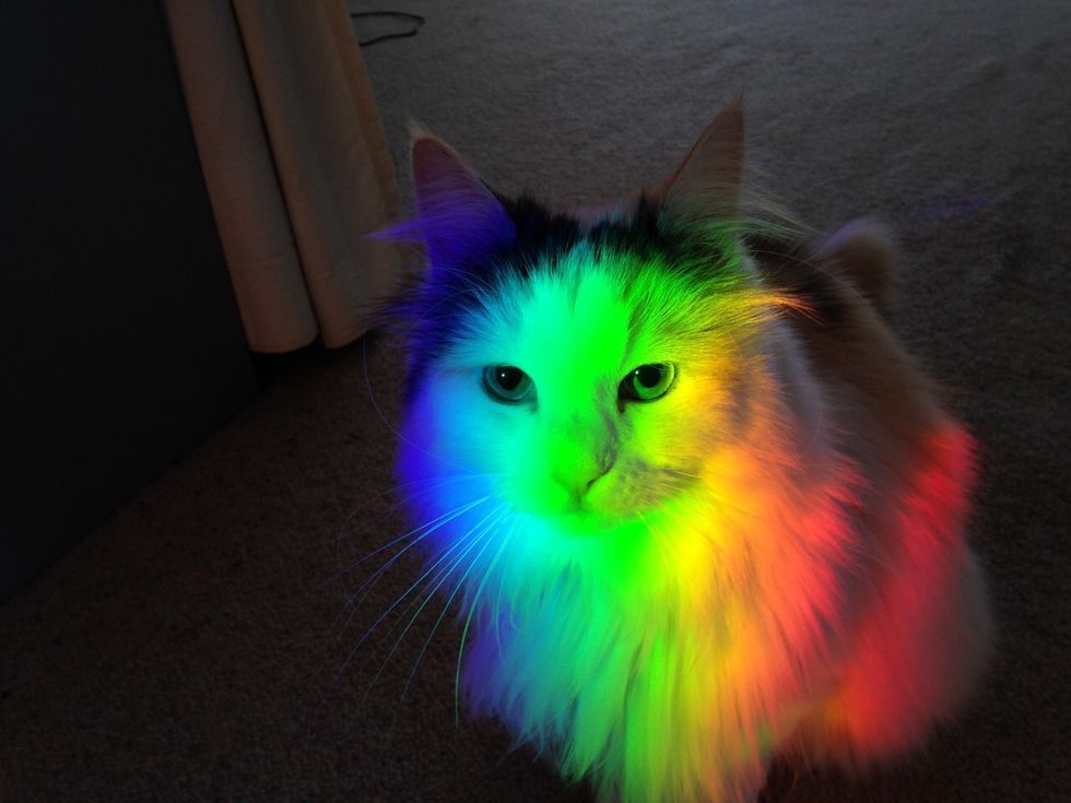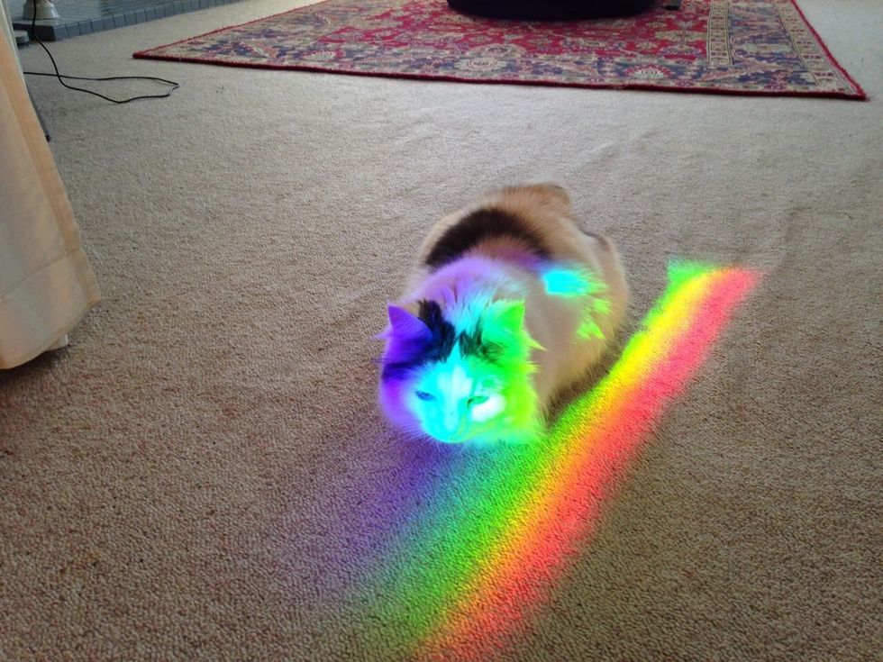 When sun light shoots through a window or glass at the right angle, it creates a prism. If it's casted onto a cat, it adds all the wonderful colors to their fluffy coat and turns them into rainbow cats.