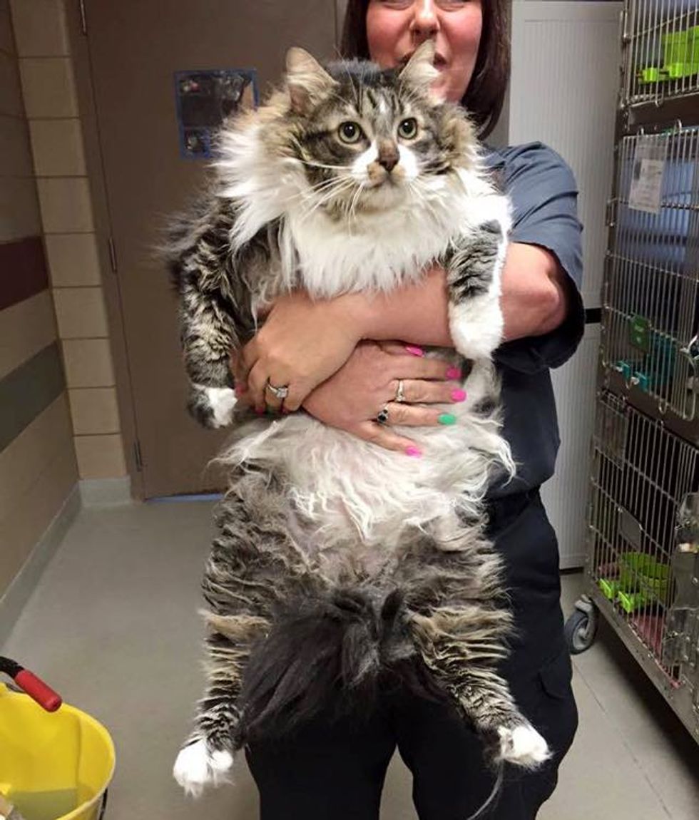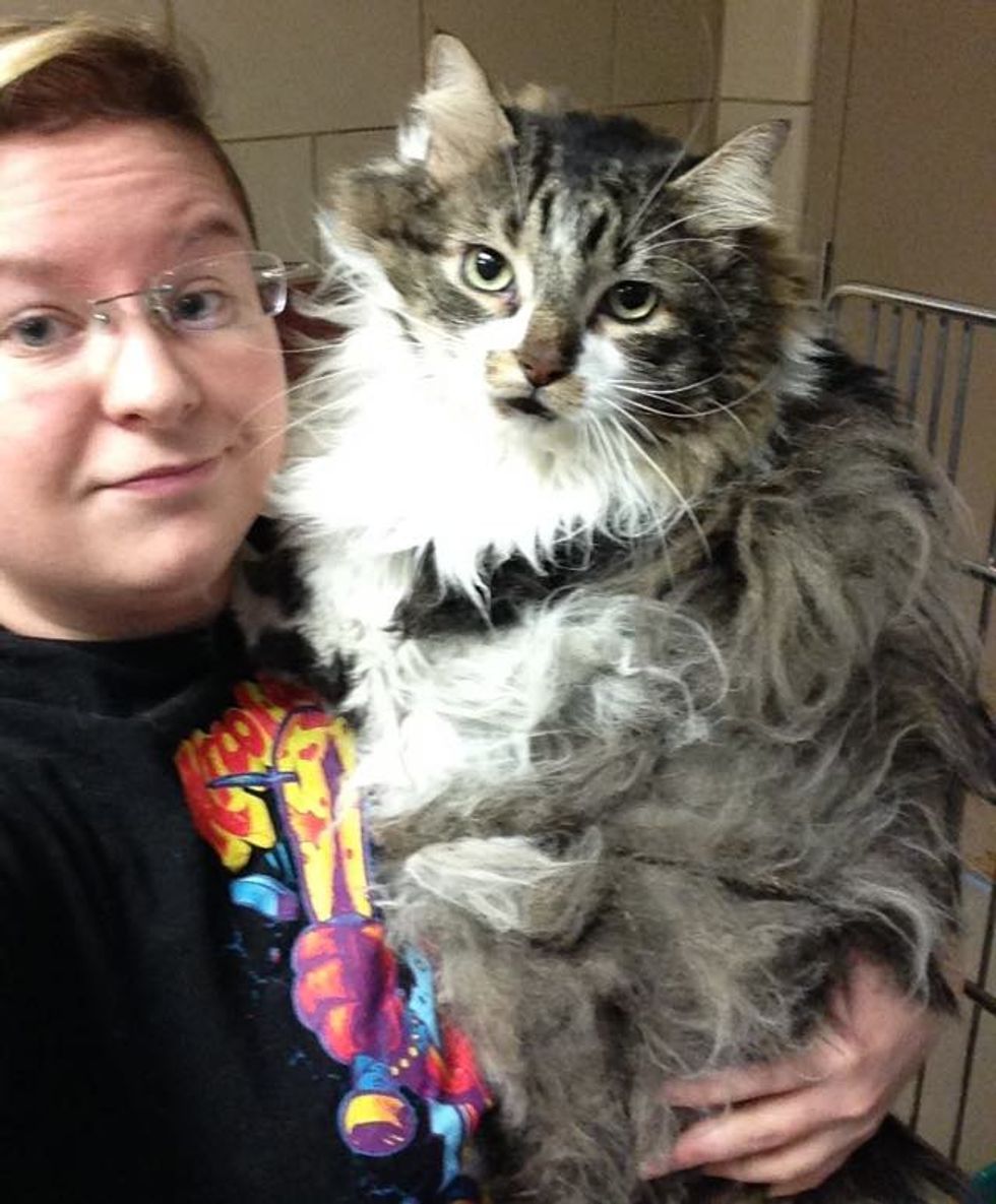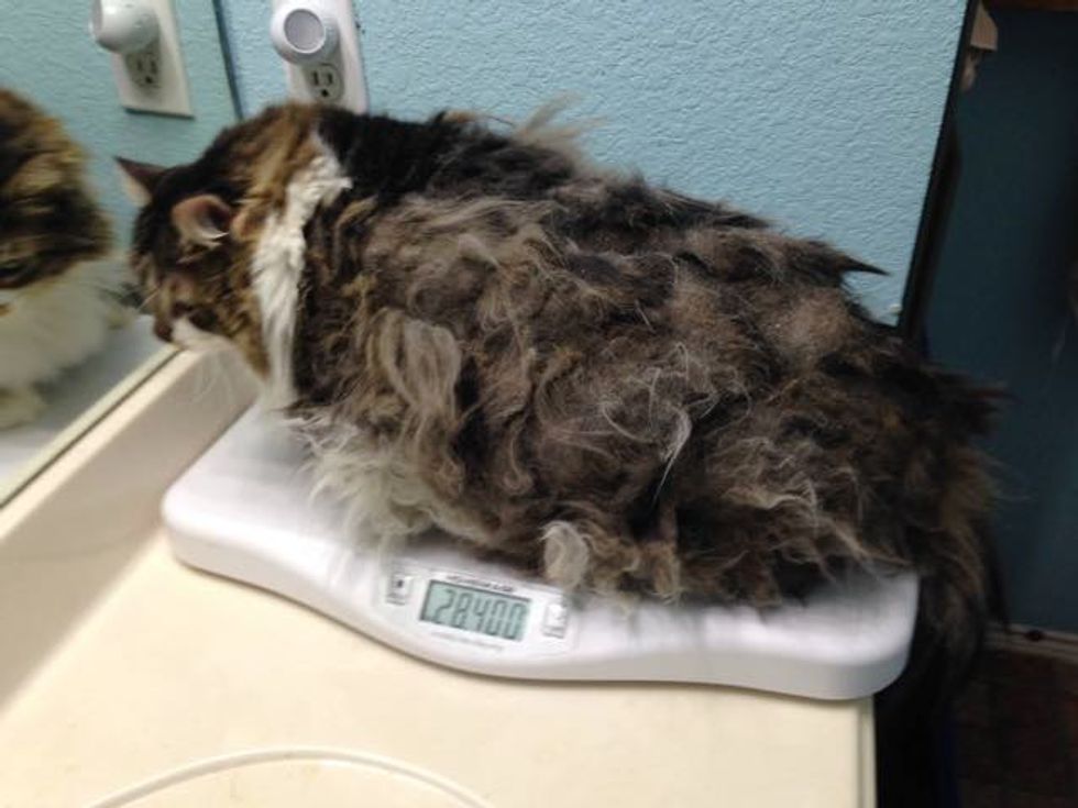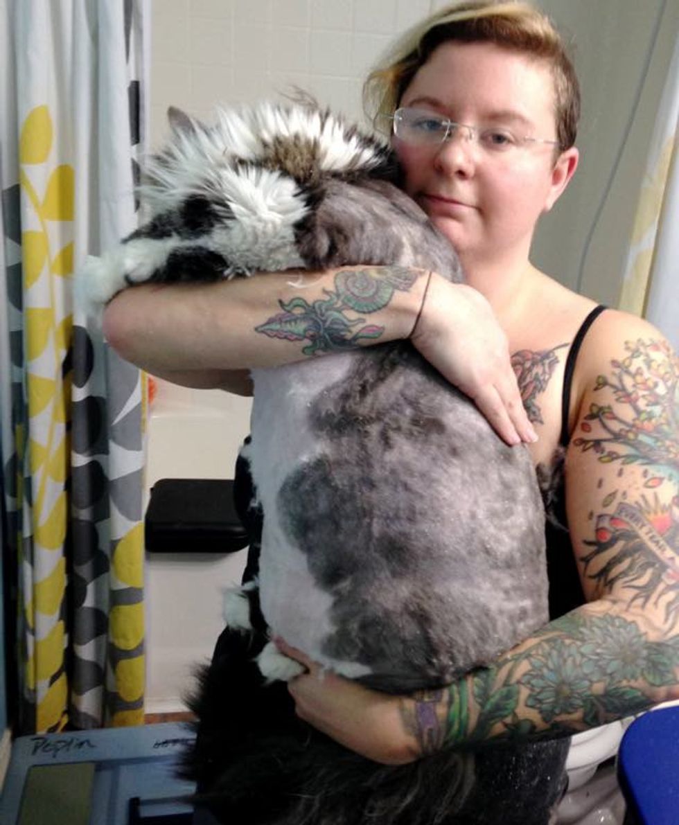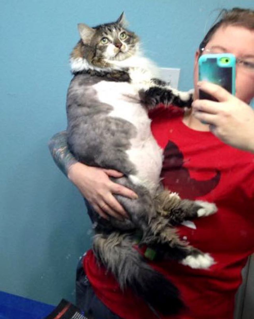 Karyn Poplin of Kitty Adventure Rescue League rescued the big kitty from the shelter and brought him into her care. "It took us about an hour to shave him, and we shaved off about a pound of matts of his big ol' belly," she told Love Meow.