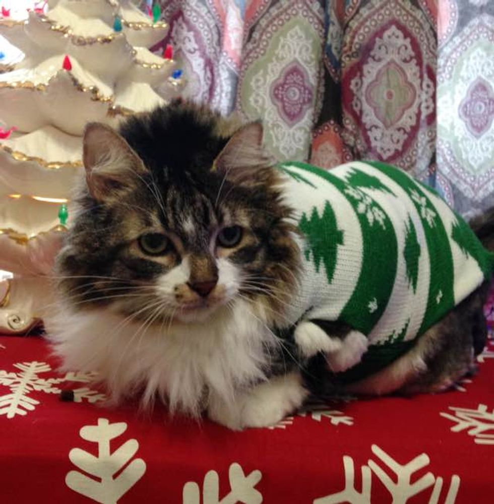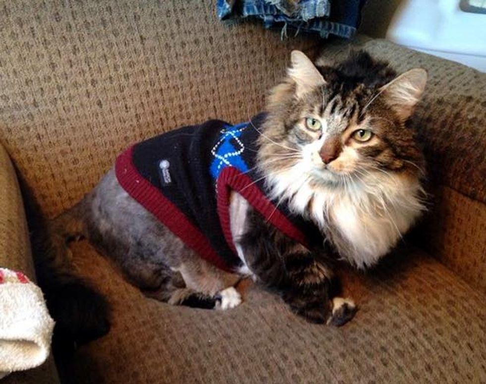 Now the weather is getting cold in Texas, they give him sweaters until his beautiful coat grows back to its glorious form.
