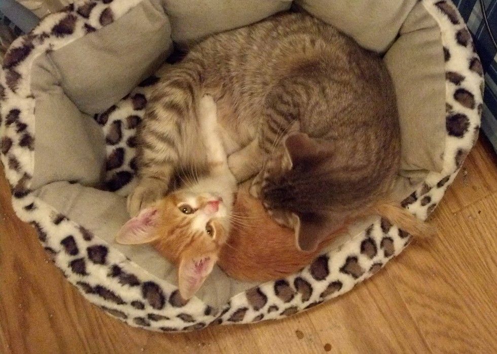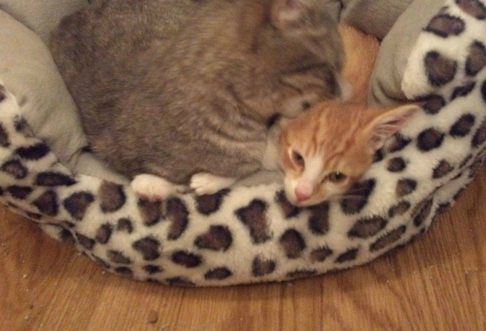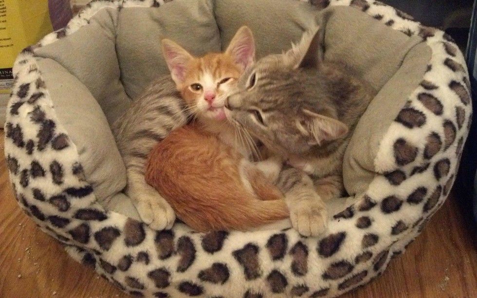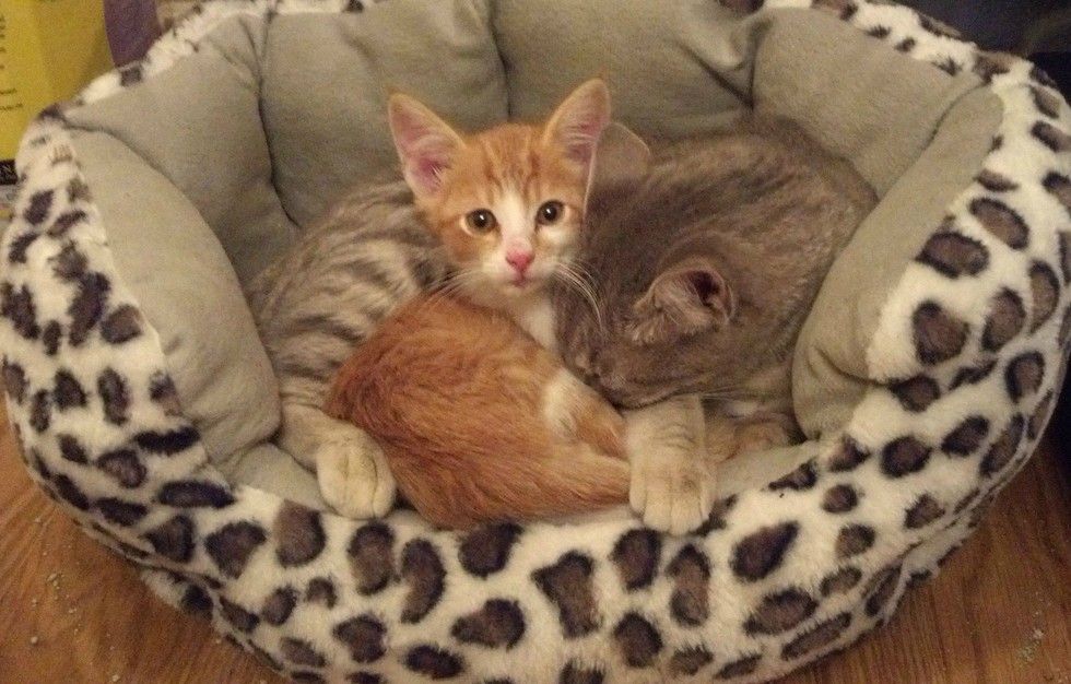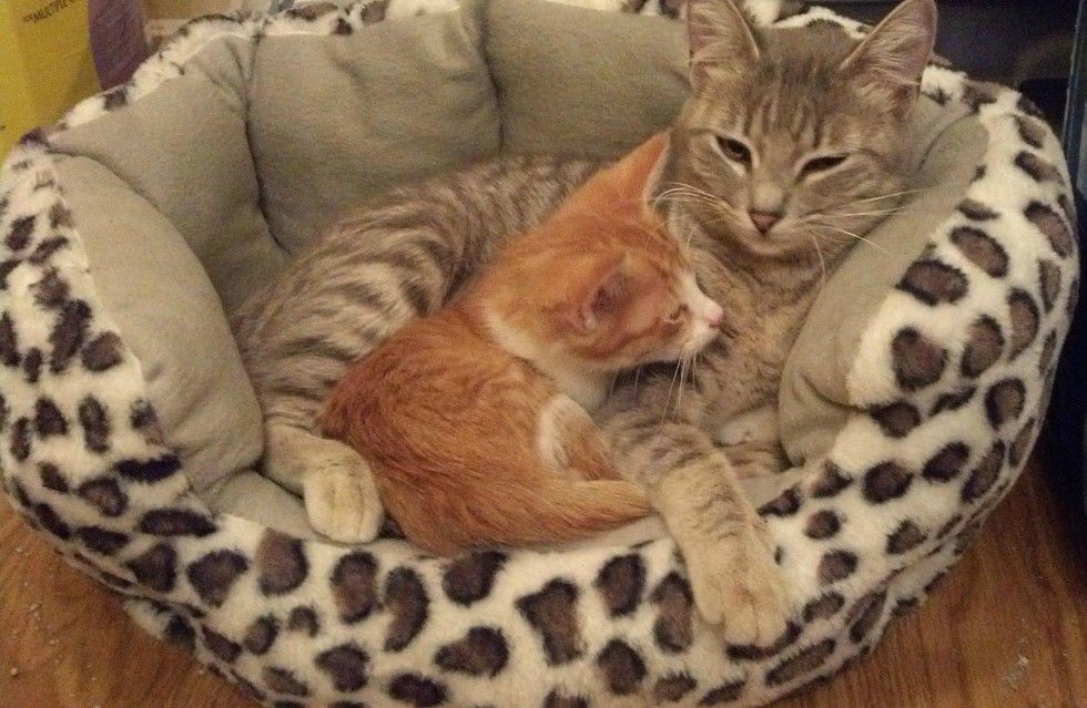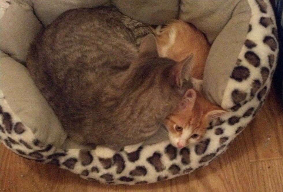 "We laid the kitten in the bed because he was weak, she climbed in and joined."