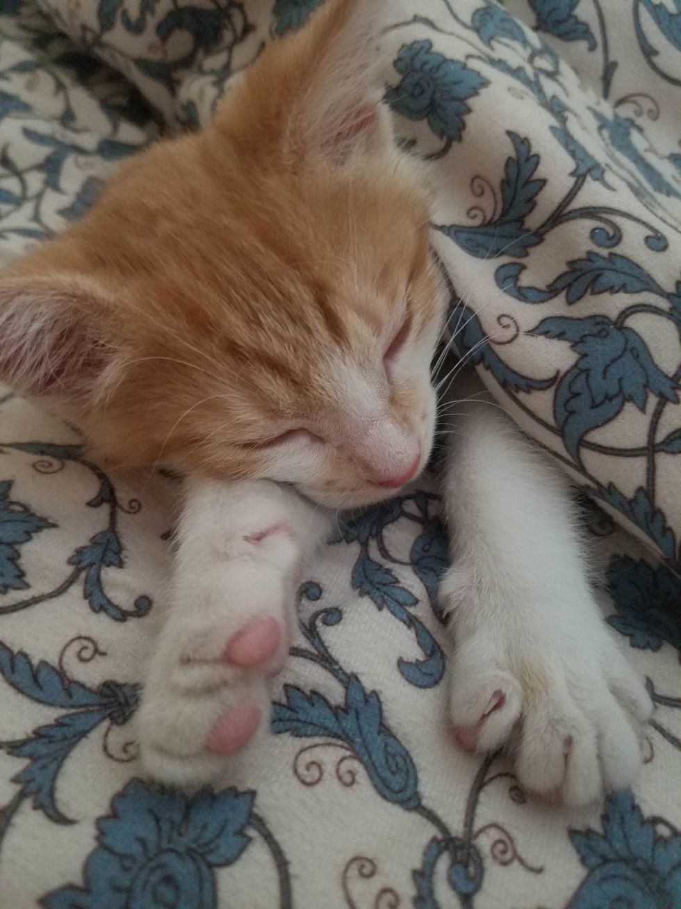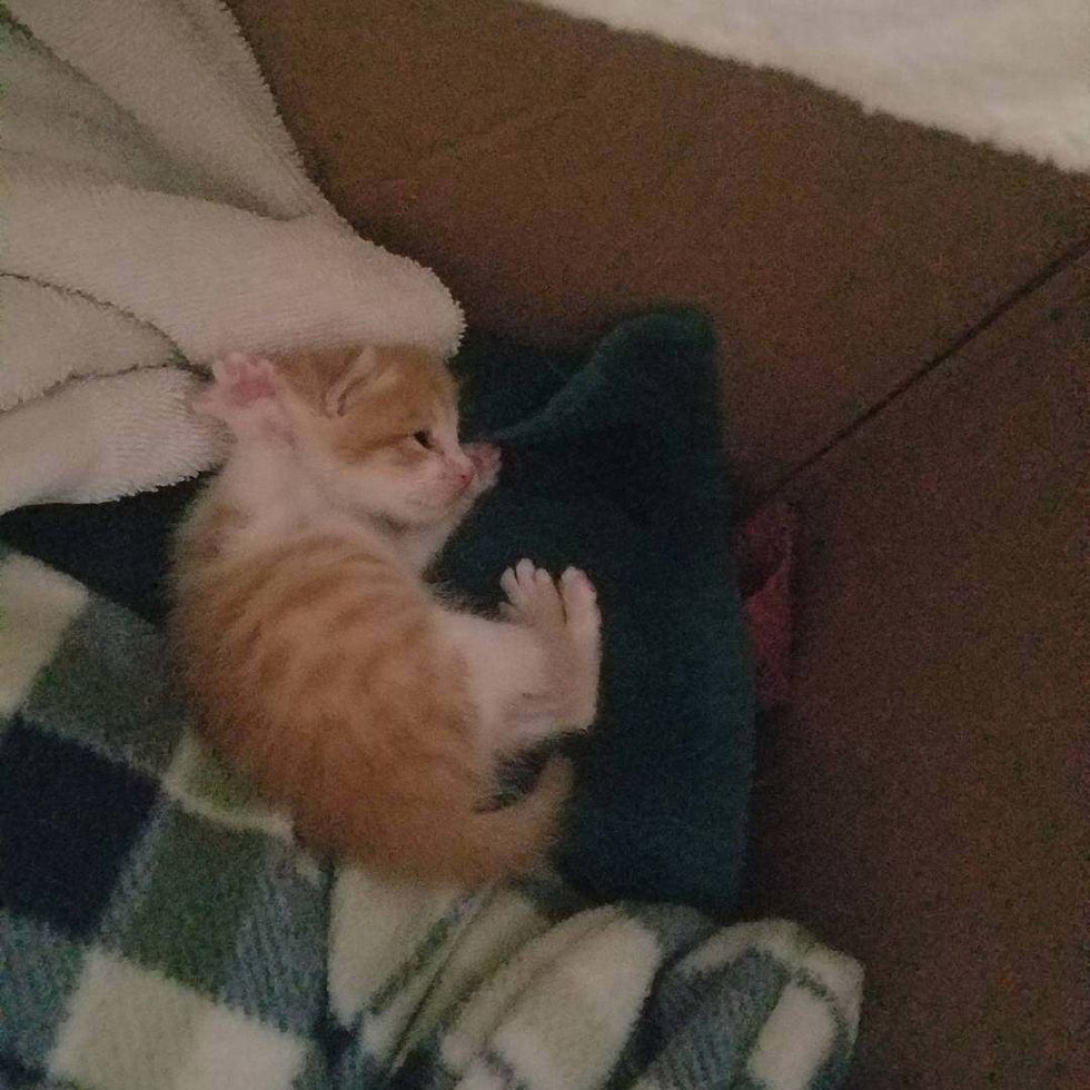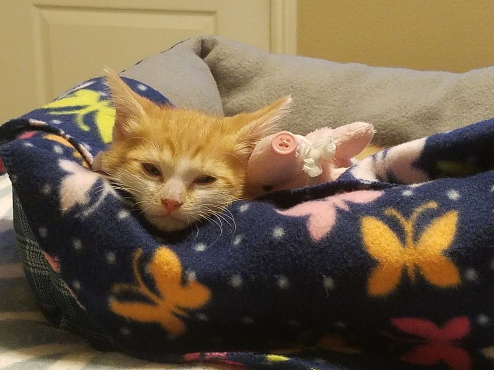 The little kitten came to them covered in fleas but after two dawn soap baths, he was finally flea free!