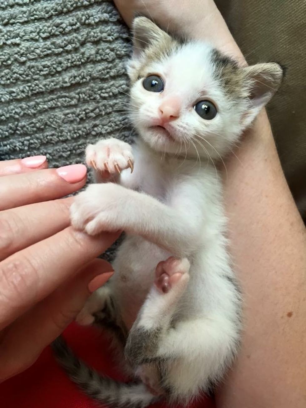 They decided to wait for the momma cat to come back while keeping an eye on the situation. "Unfortunately the mother didn't seem to be doing her job and the kittens didn't appear to be doing well. Eventually we decided we had to take them in, and only then did we realize that the three of them were stuck together in a tangle of umbilical cords."