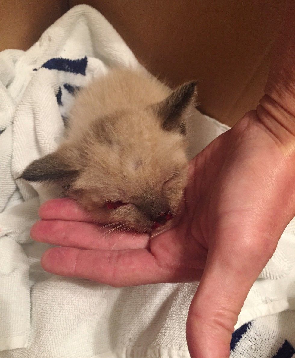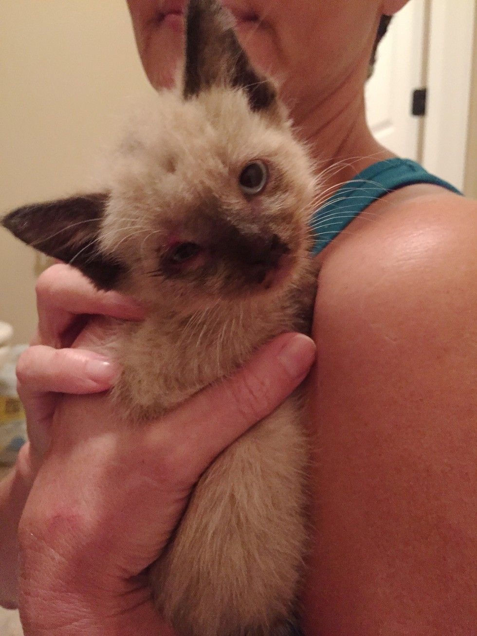They brought the kitten to the vet's office to get medical help as soon as they were open. The 4-week-old kitten was covered in fleas, weighed just one pound and had a severe eye infection, but he was finally on the mend.