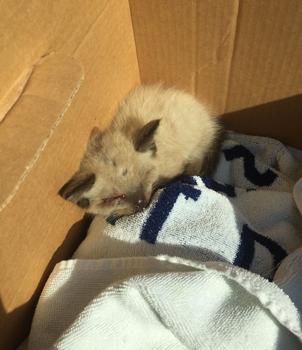 They quickly stopped their car, scooped up the kitten and brought him to safety. The kitten was trying hard to hang on. "He had bloody cuts on the top of his head, and his nose and mouth were bleeding pretty badly. For a while, we didn't know if he even had an eye because his eye was so swollen."