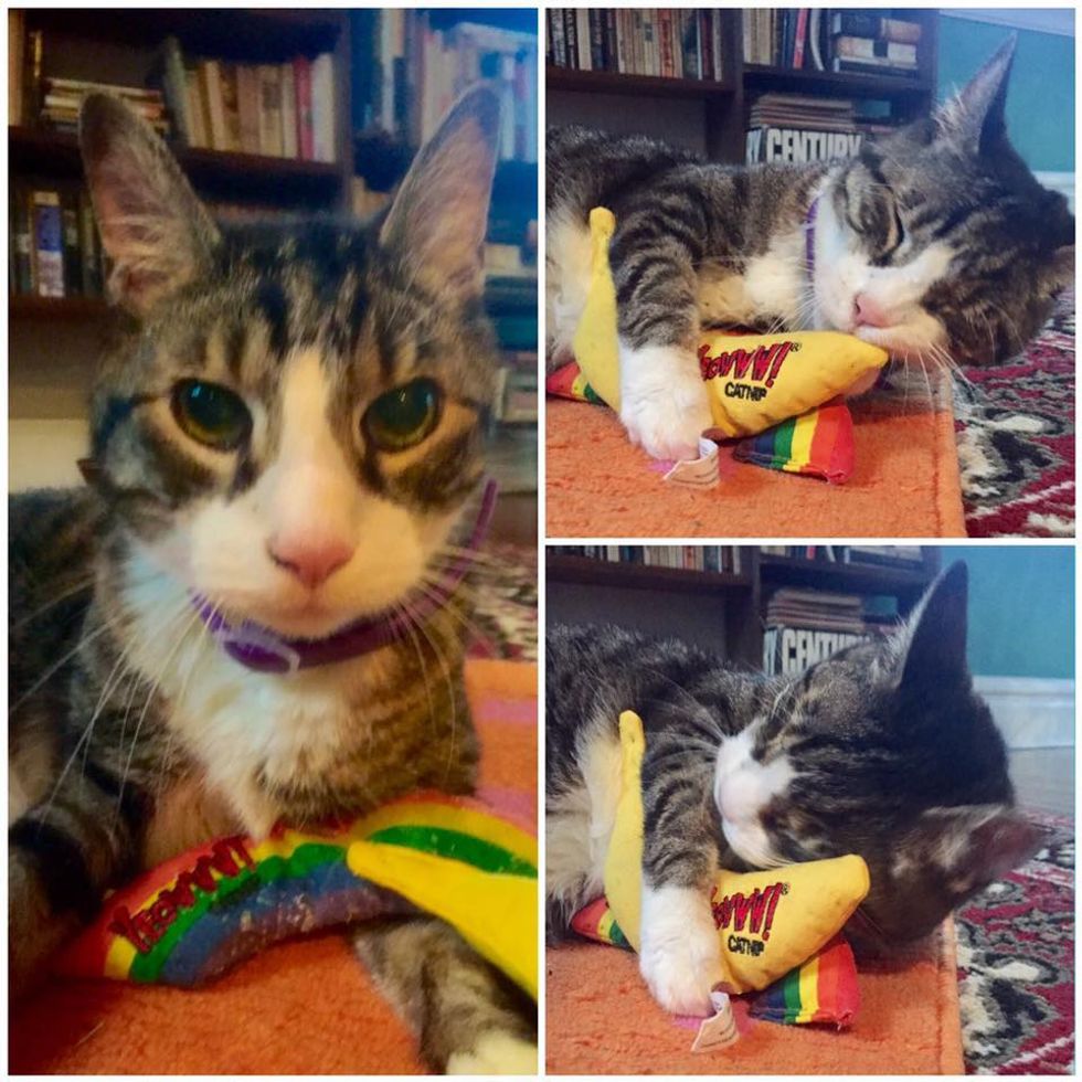 He started to play and showed that he's really just a kitten at heart. Bobs rubbed all over his favorite catnip toys in pure bliss!