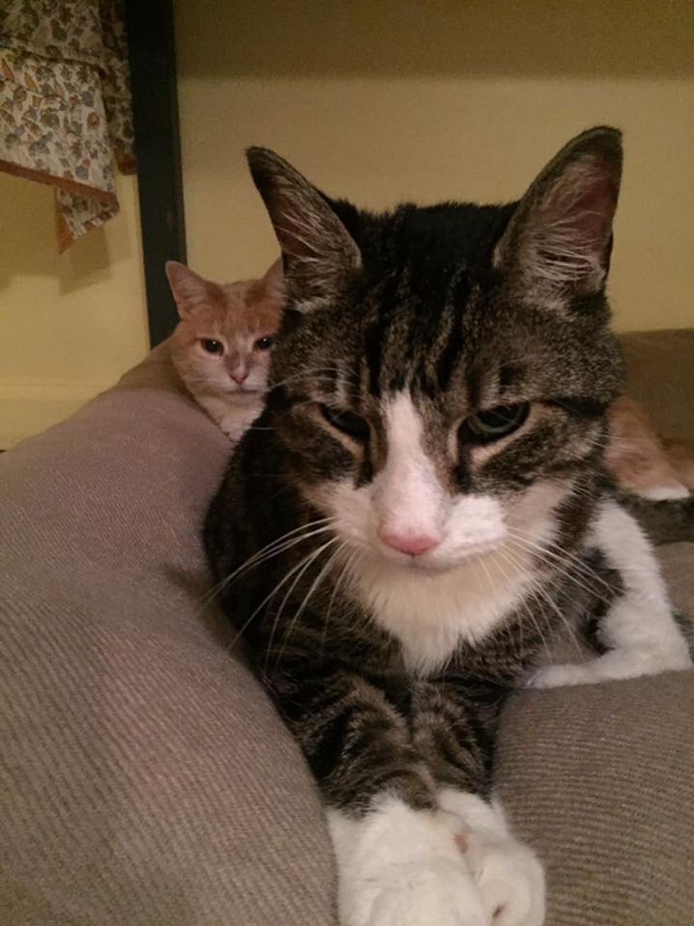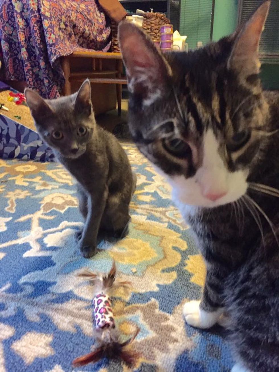 Baby Sammie, a foster kitty, follows in Grandpa Bobs' paw prints.