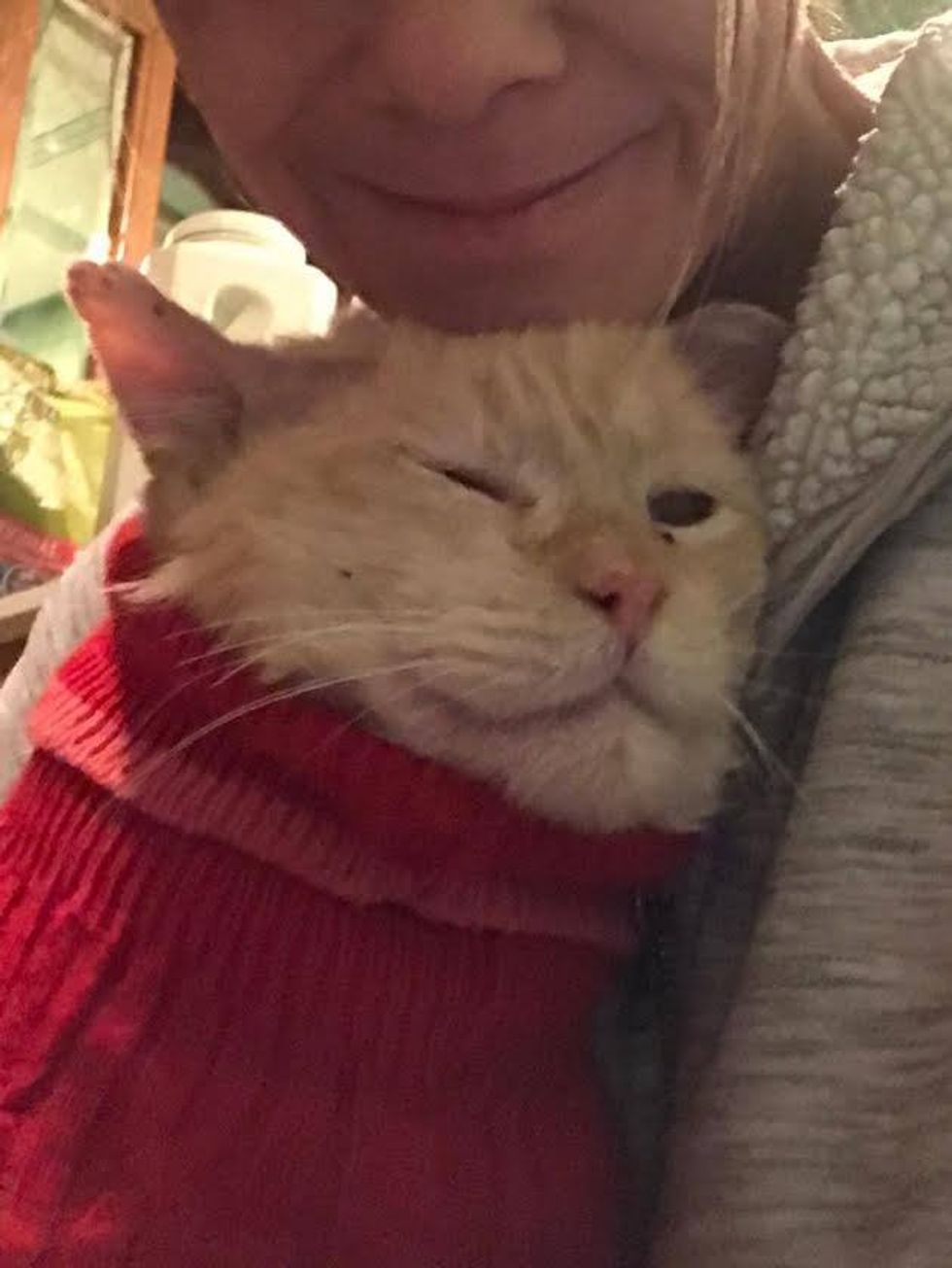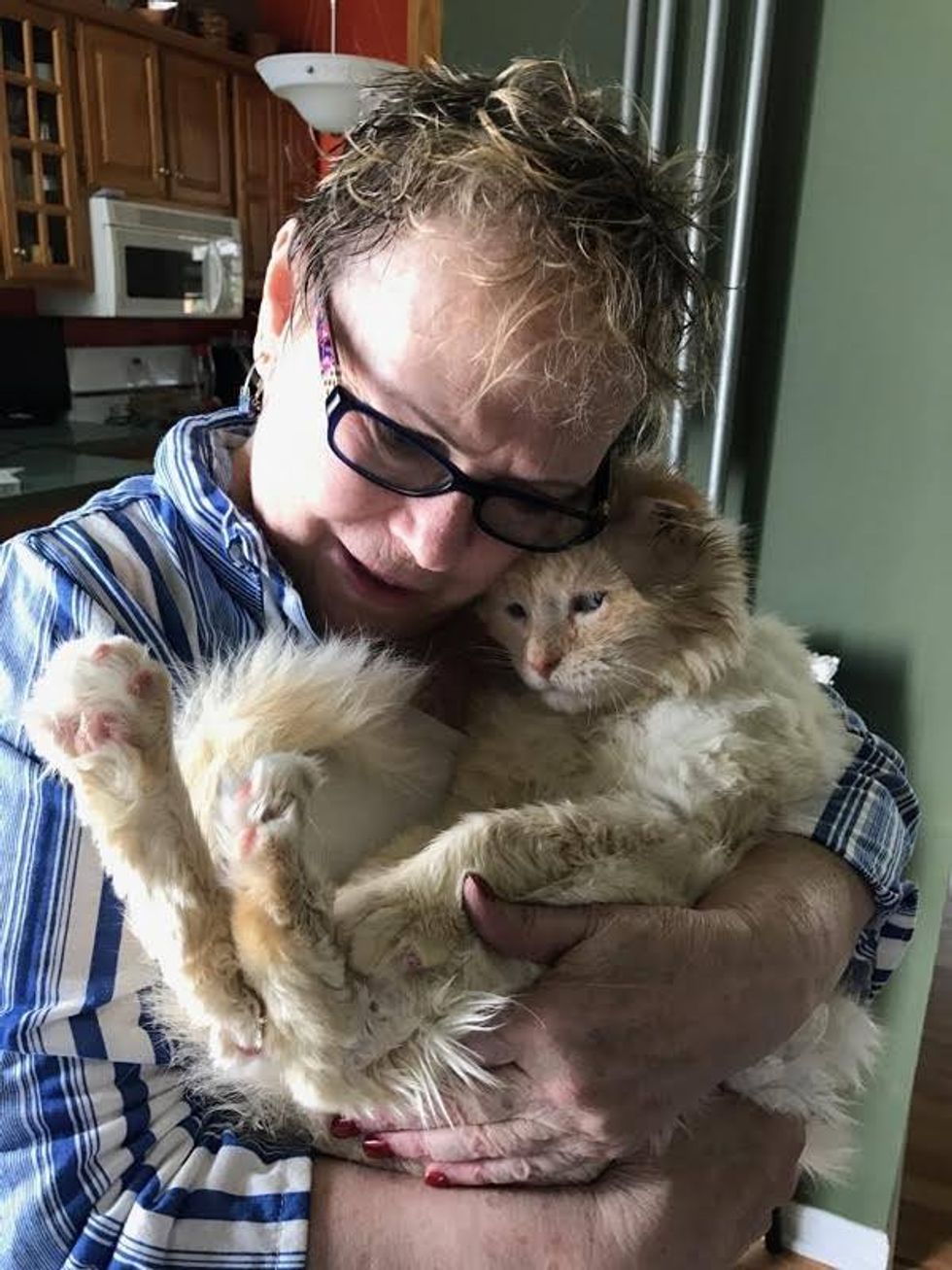 Nutmeg cuddled with his foster mom, purring up a storm.