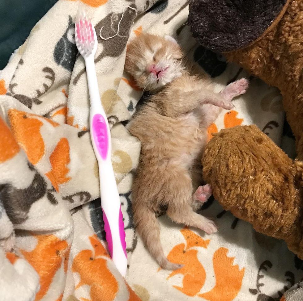 "She was about four days old and 80 grams (1.7 pounds) — a tiny peanut. She was very dehydrated and covered in fleas, which is dangerous, as kittens can't afford to lose any blood when they're this little."
