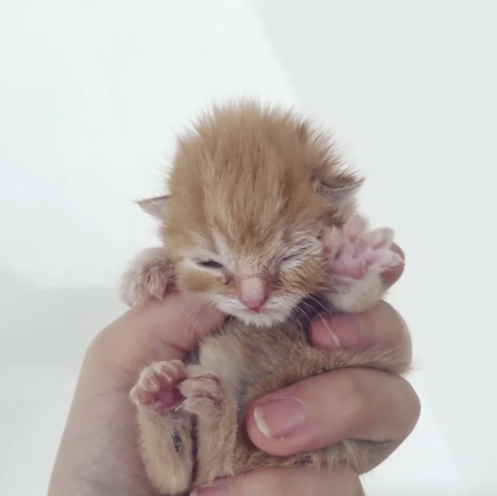A palm-sized orphaned kitten found herself in a tissue box at a pet supply store, squeaking for her mother. A rescuer rushed to save the tiny ball of fur and brought her back from the brink.