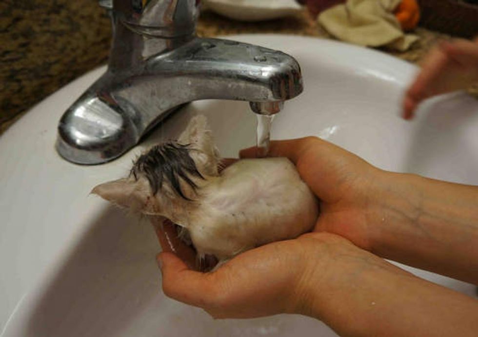 Paula worked alongside her husband Richard in the rescue. They carefully sawed through the wall and removed a small four-inch square piece of drywall. What they saw next was a skinny kitten covered in fleas, crying for help. The kitten appeared to be sick and needed immediate medical attention. They gave the kitten a very needed bath and hand picked the fleas from his fur.