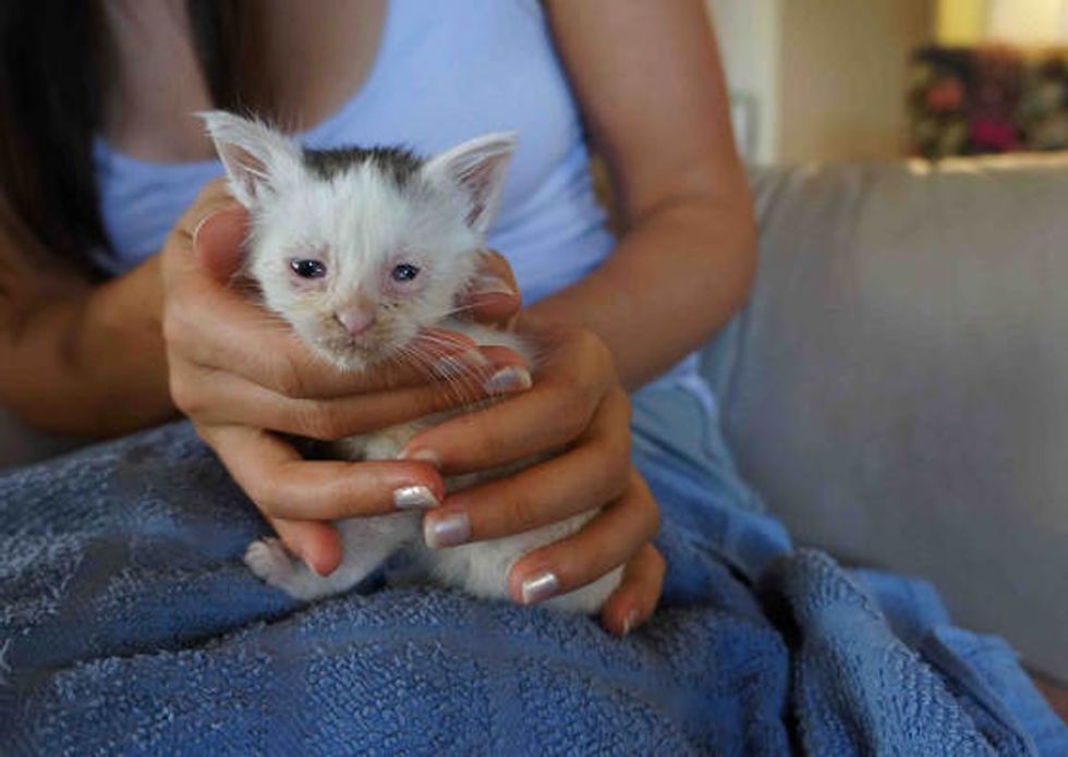 A tiny kitten was rescued from inside a wall. He was skin and bones, covered in fleas.