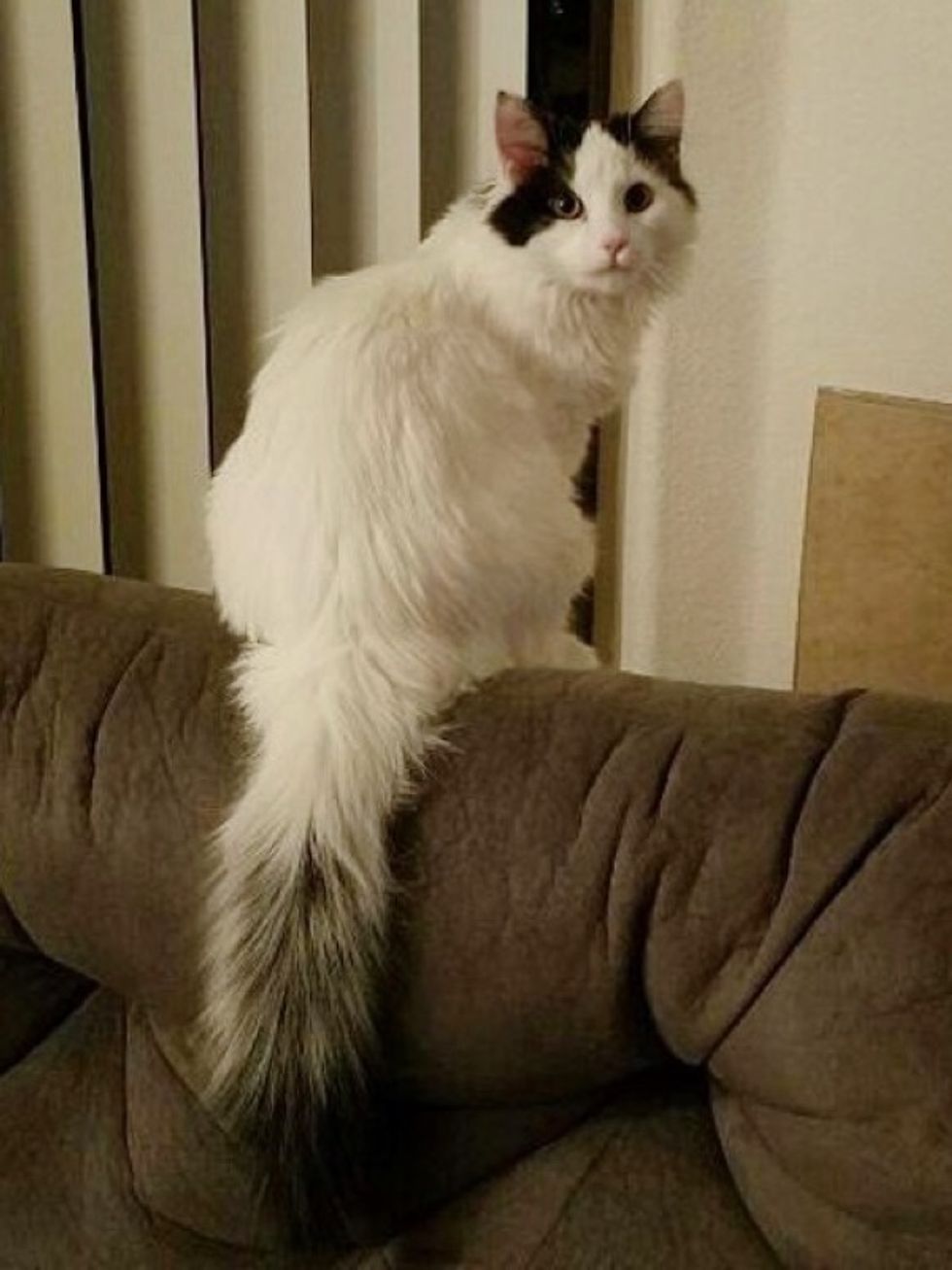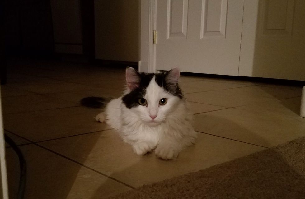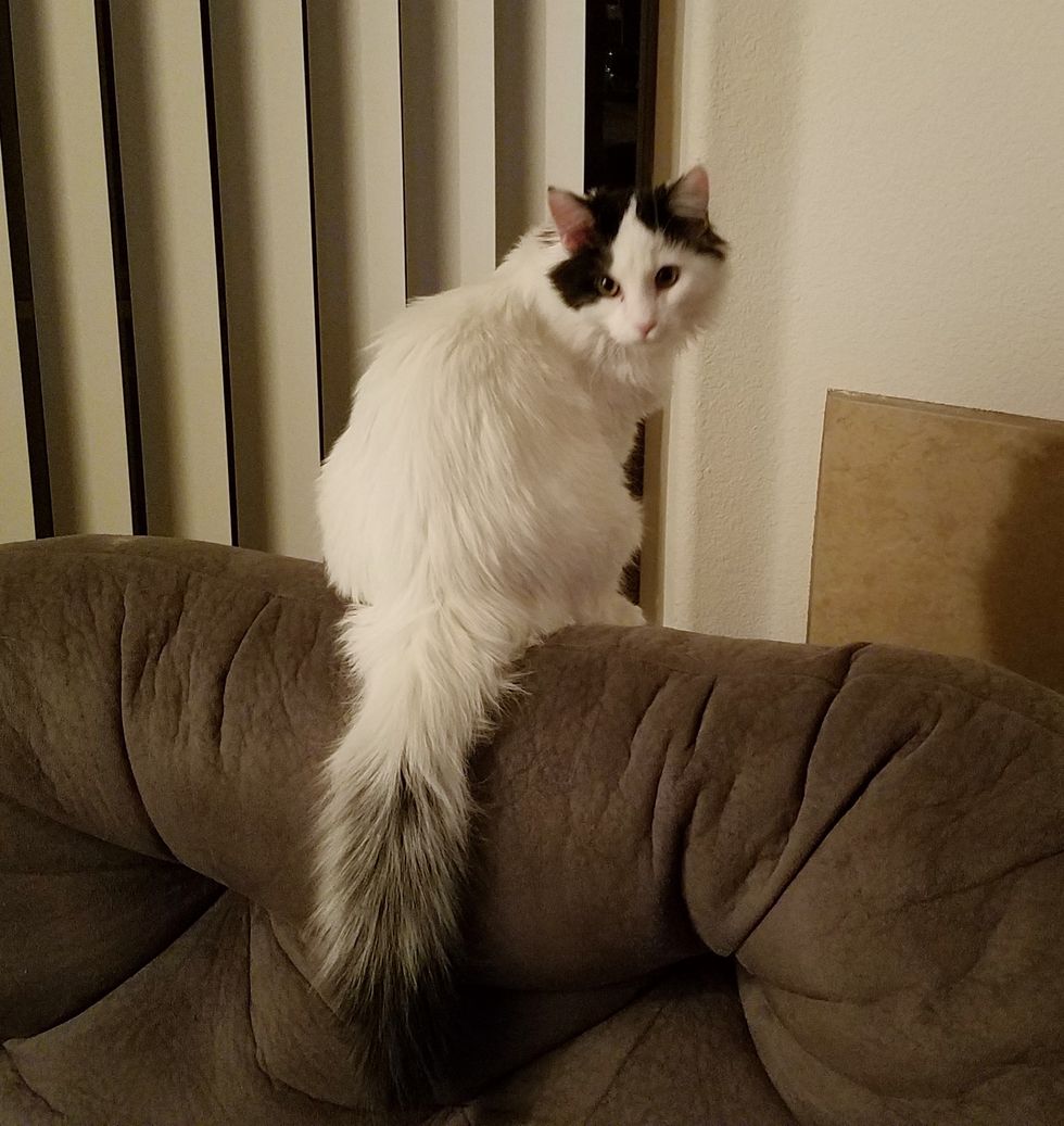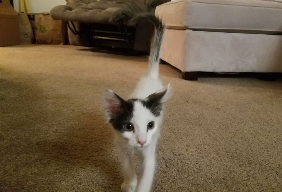 Little Aava came out from his hiddy spot and slowly walked up to his human with his tail gradually rising up into a little hook.