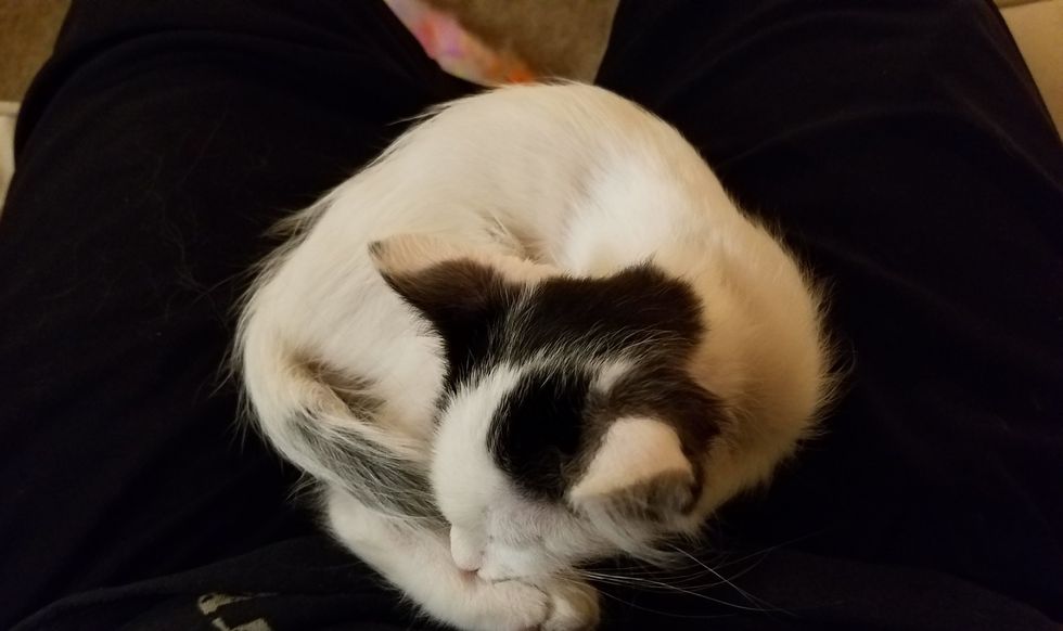 That shy little kitten curled up in a ball of fur, purring aloud in his human's lap. He stayed there for a long time and didn't want to wake up.