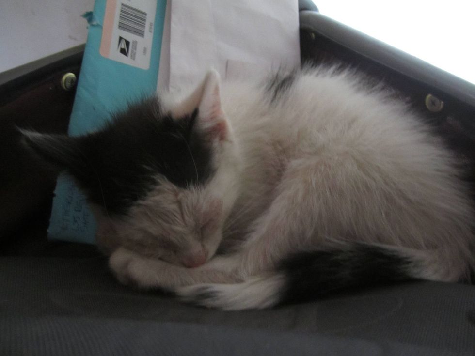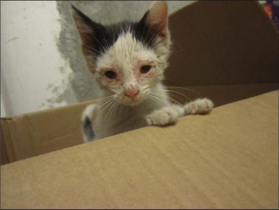 After a trip to the vet, the little feline was prescribed antibiotic gel for his eyes and an oral antibiotic for an upper respiratory infection.