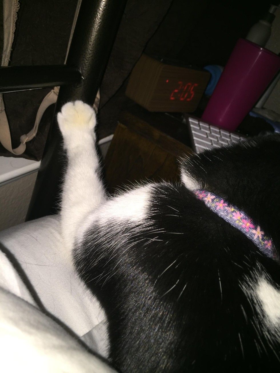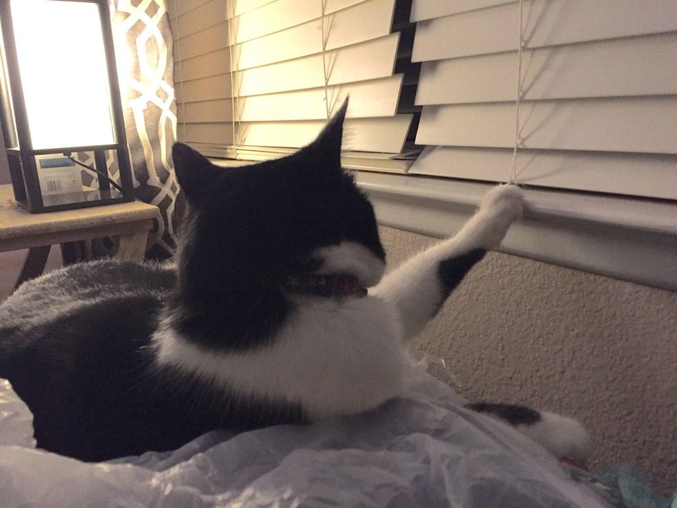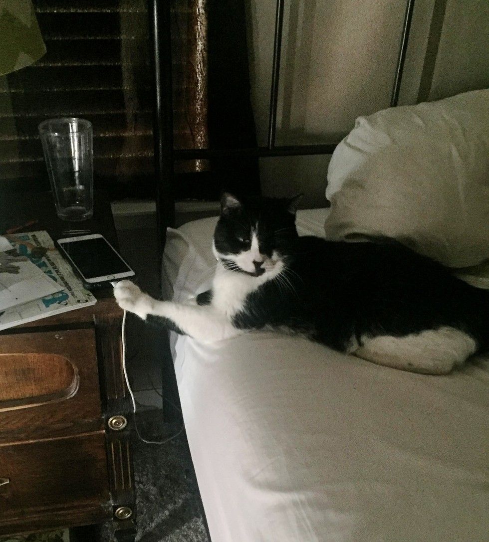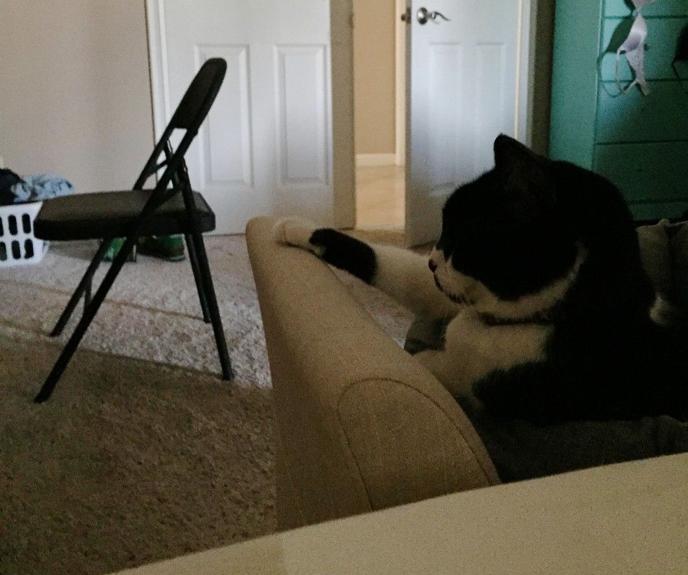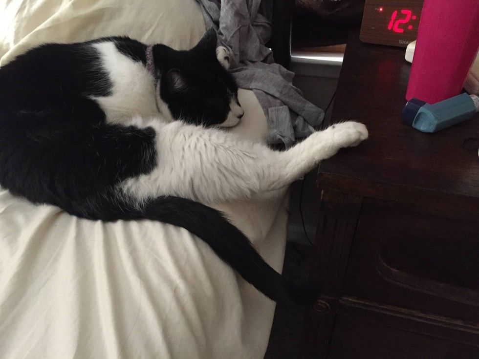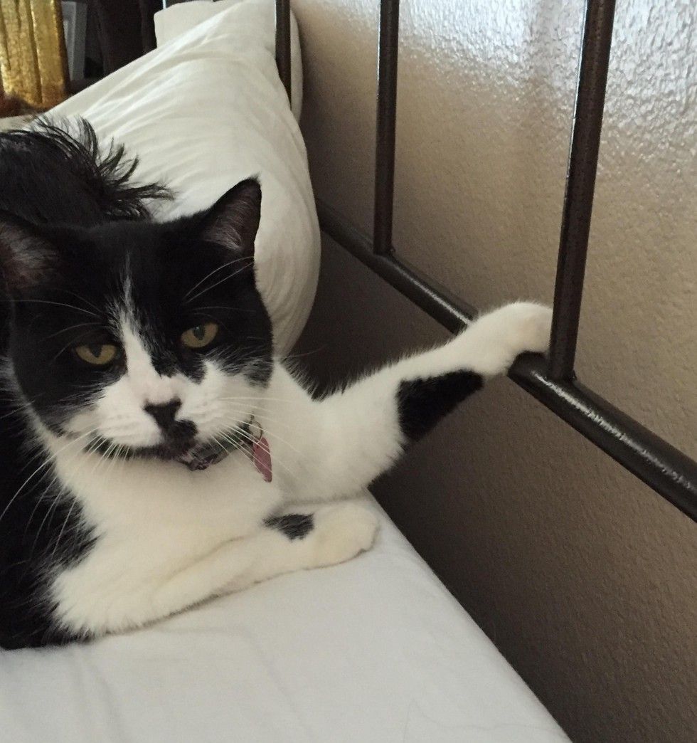 This tuxedo cat has a habit of putting her paws on things whenever she lies down or just chills. It looks as if she is constantly reminding her humans she owns everything she touches while vegging out.