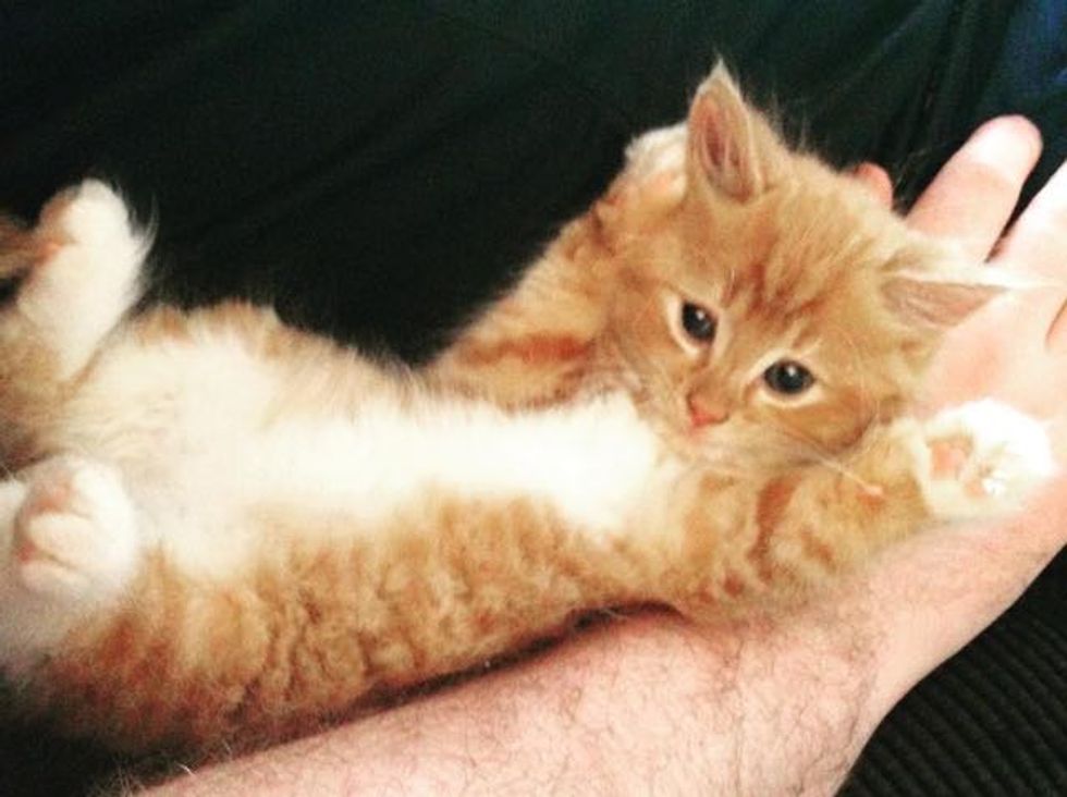 "He was so tiny! Literally the size of my hand. He's been loving since I got him and constantly followed me around. He's always purring away in my ear!"