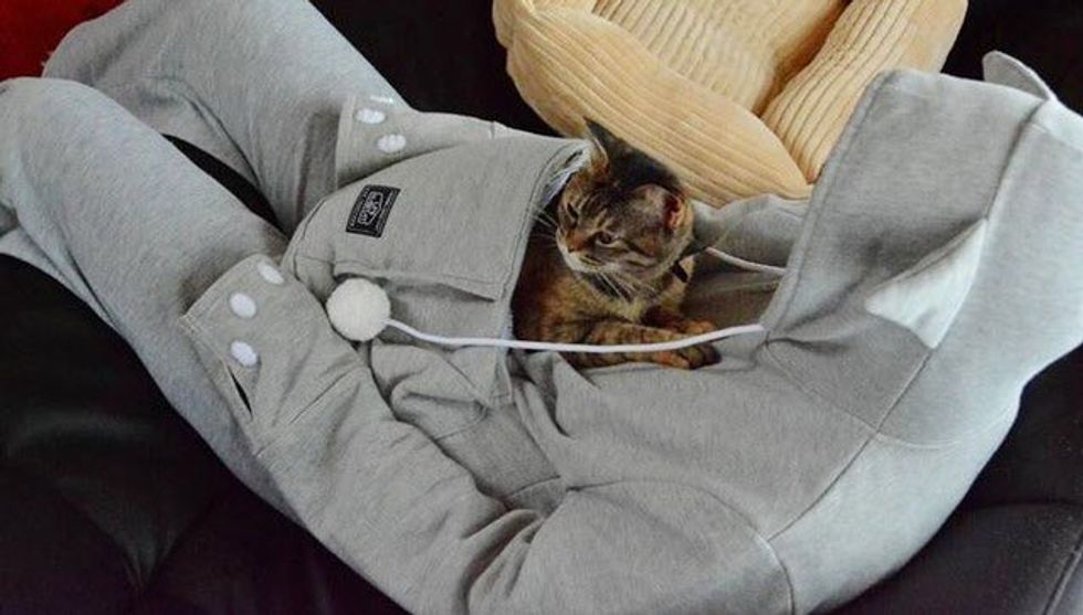 The brilliant folks from Unihabitiat, a company in Japan, came up with a great idea for animal lovers and their beloved companions to stay inseparable no matter what they do. The Mewgaroo hoodie was born! It's a hoodie that has a pouch that resembles that of a kangaroo mom’s.