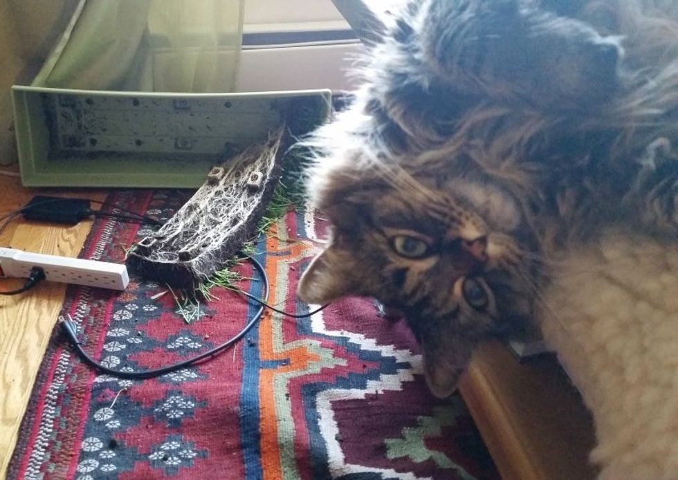 It was early in the morning, this kitty's human woke up to what appeared to be the end of her greenery she planted just a week ago. The suspect was right there with her, purring away.