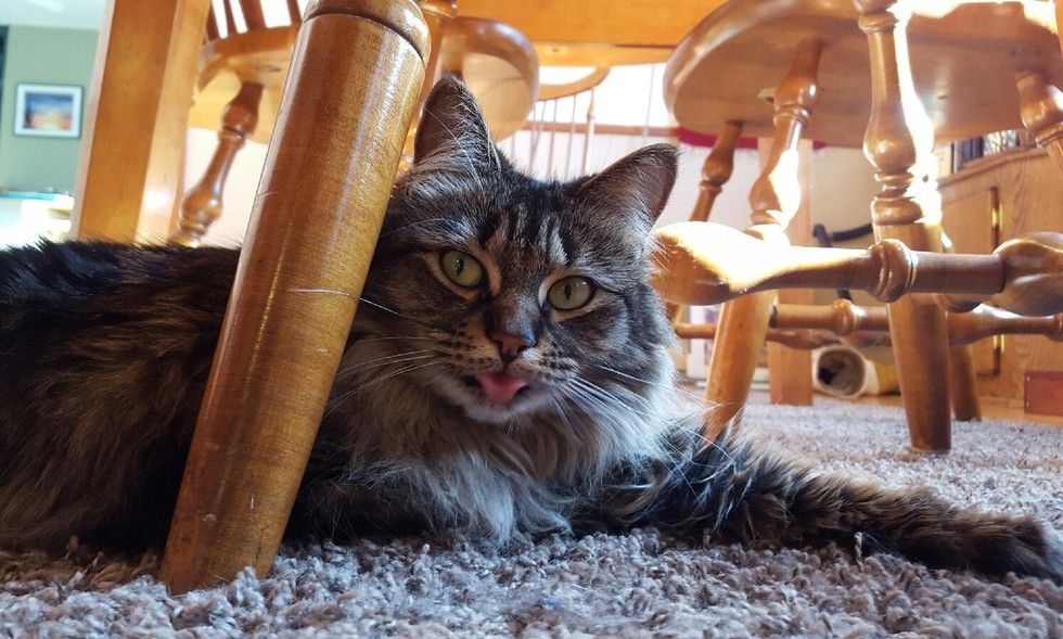 "She's potentially got a lot of Maine Coon blood. She was rescued from a bad situation at around 1-2 years old and may have been malnourished, which would explain her stunted size. She's only about 8 lbs."