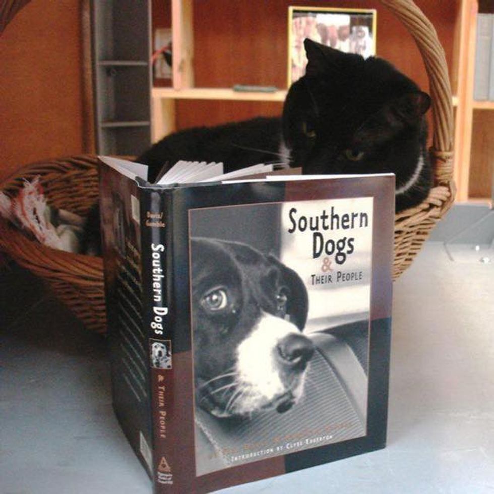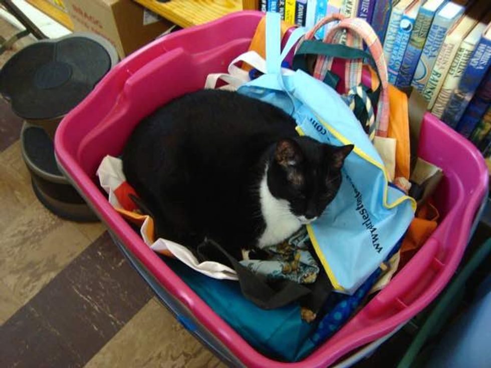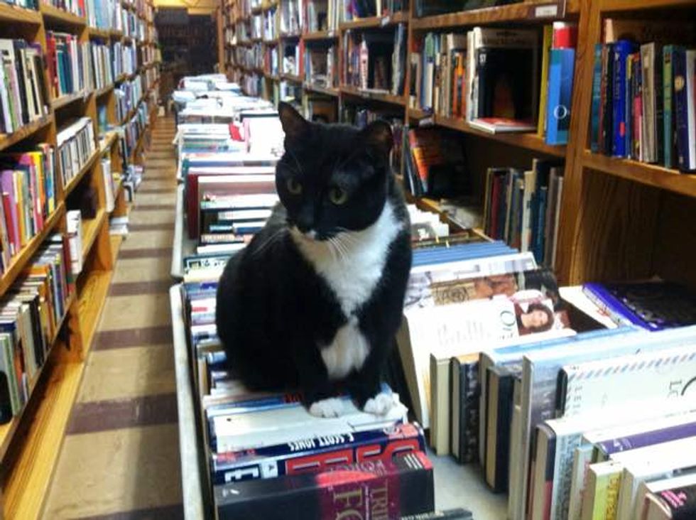 The kind folks at Book Buyers in Charlotte, North Carolina took in a tuxedo cat named Page after they found her abandoned outside their shopping complex by the dumpster. She was just a tiny kitten then.
