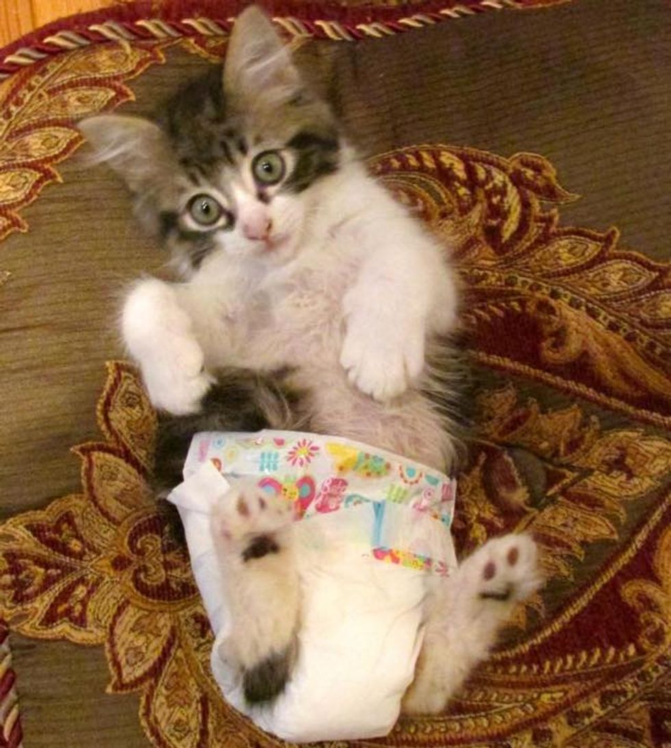 "I must say Bebe is pretty special .The Manx breed is like a rag doll. He purrs and talks and eats and plays all the time. My special friend Maureen made Bebe diapers and it has helped tons," Cheri added.