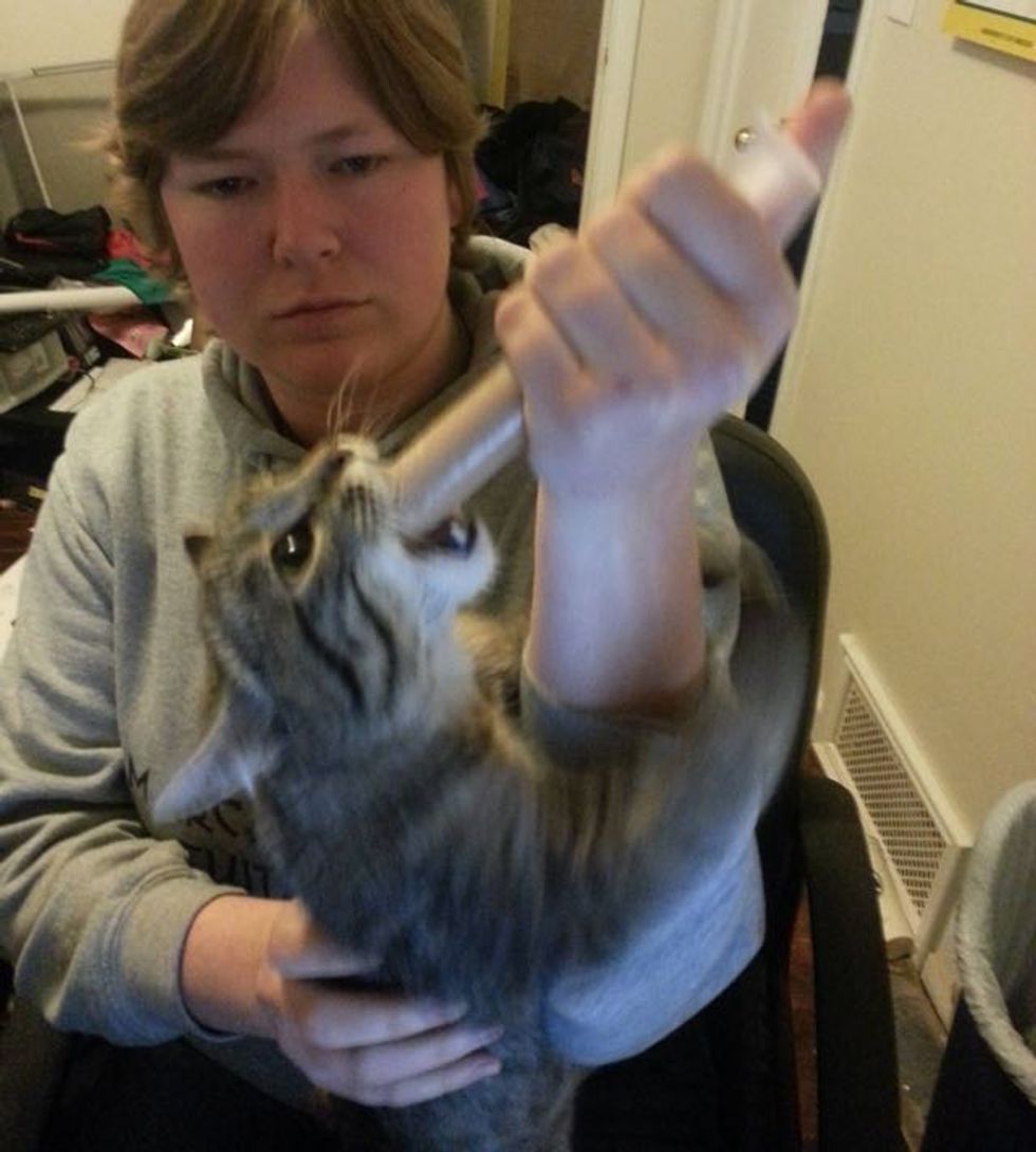 "It takes about 15 minutes to give him one feeding, and another 5-10 minutes of holding him up after to make sure all the food made it into his stomach."