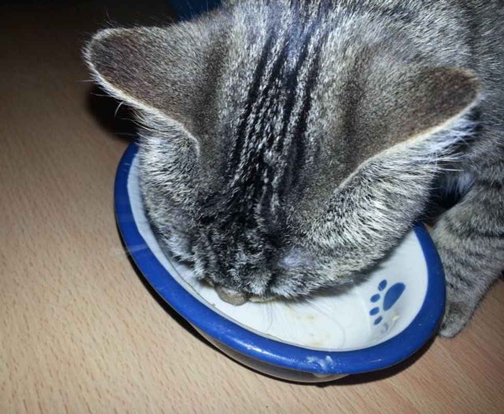 2 months post surgery, Link could eat his pureed canned food out of a bowl. "Seeing improvement every day, and he is fat and happy!"