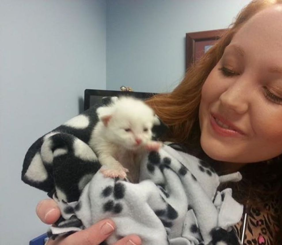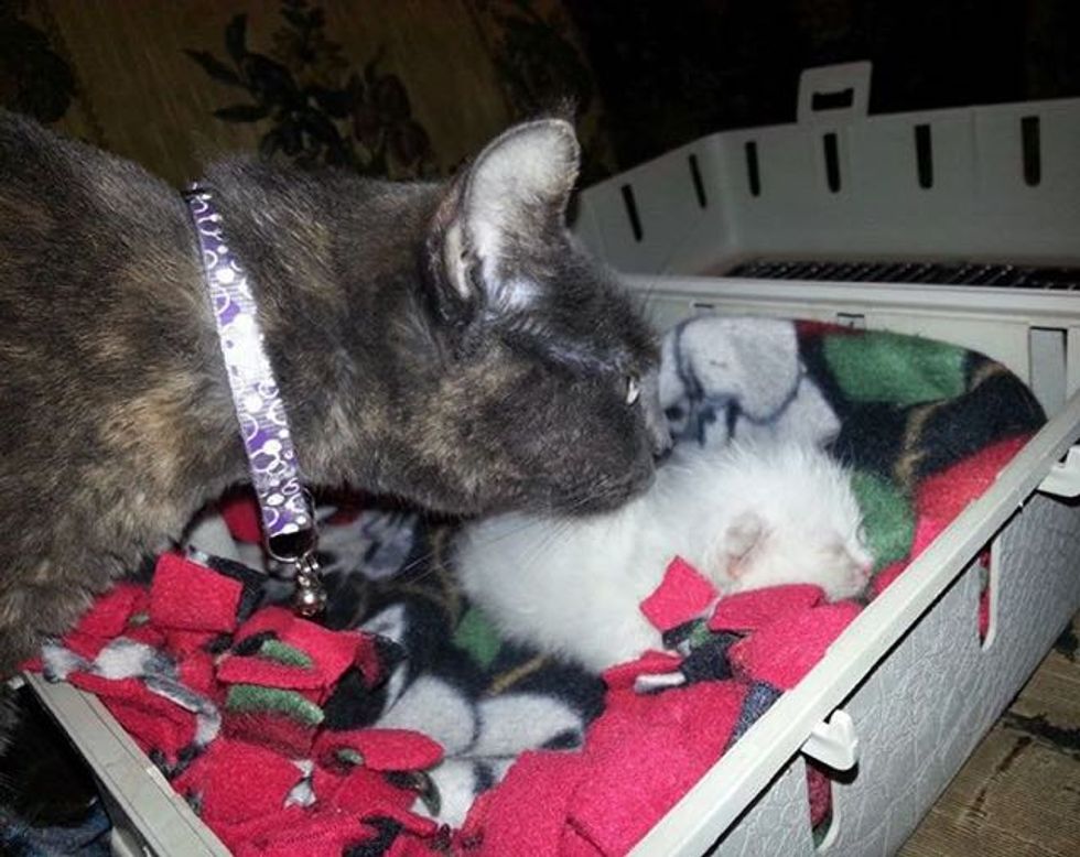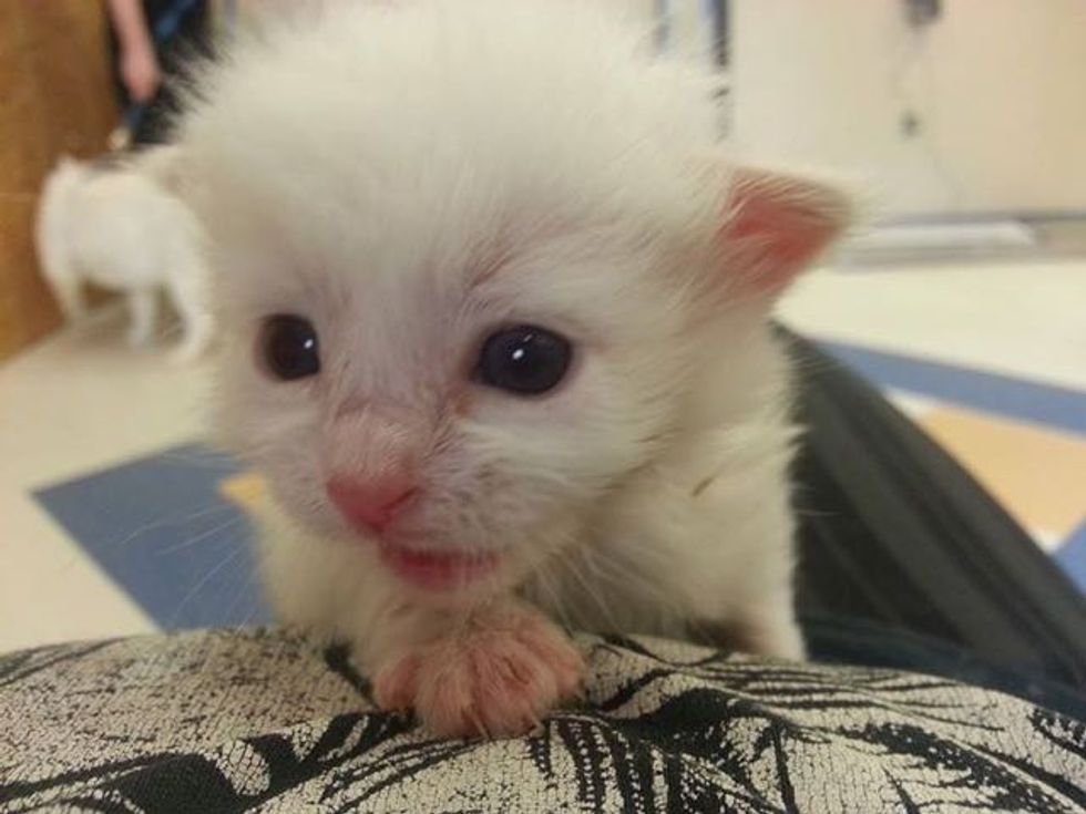 "They guess him to be about 10 days old. He was taken to my vets with a nasty gash on his neck down to the muscle. He got cleaned up, stitched up, and antibiotics. His mother has refused to feed him since the attack because she is so traumatized also. My friend Julie is bottle feeding and fostering him until he's 6 weeks old," Carla writes.