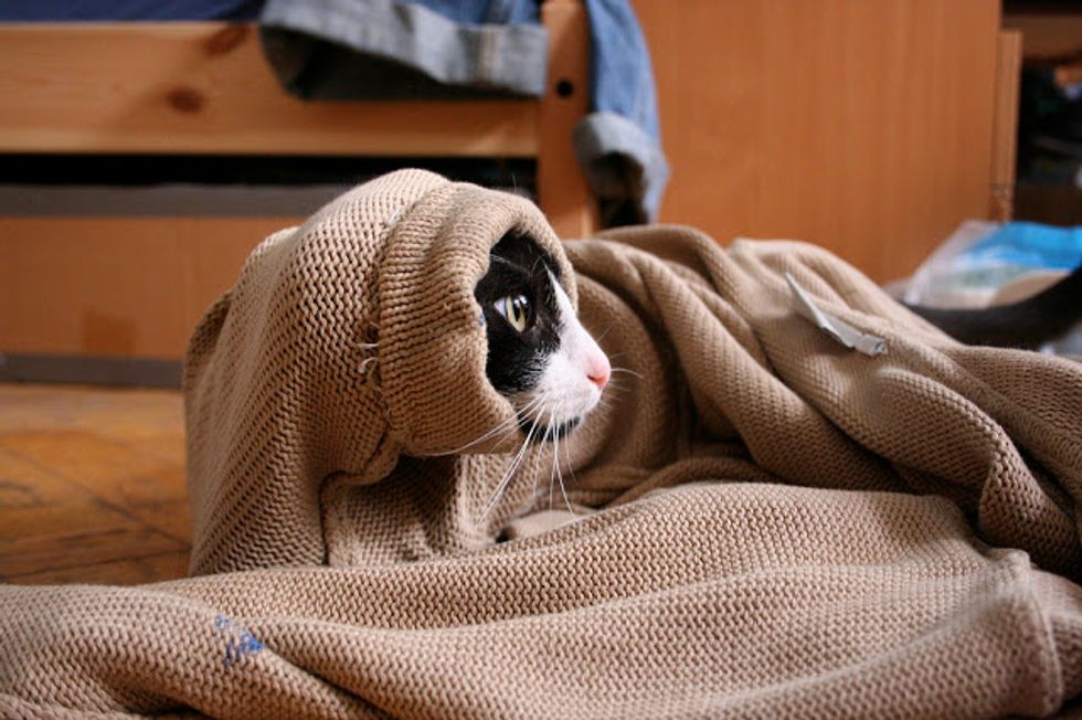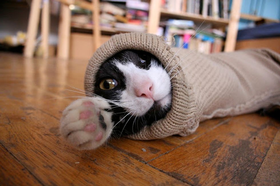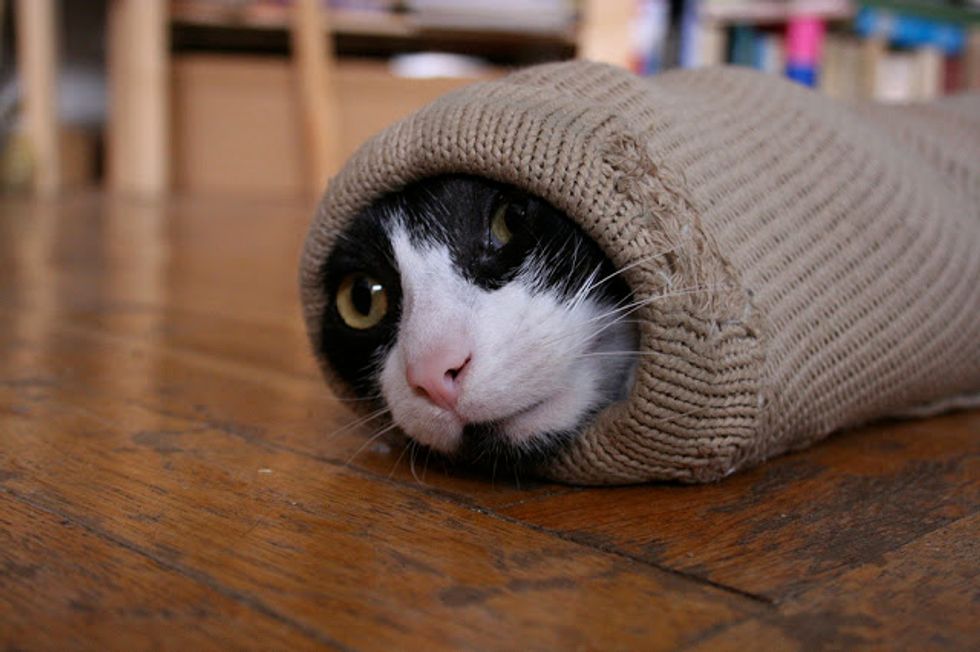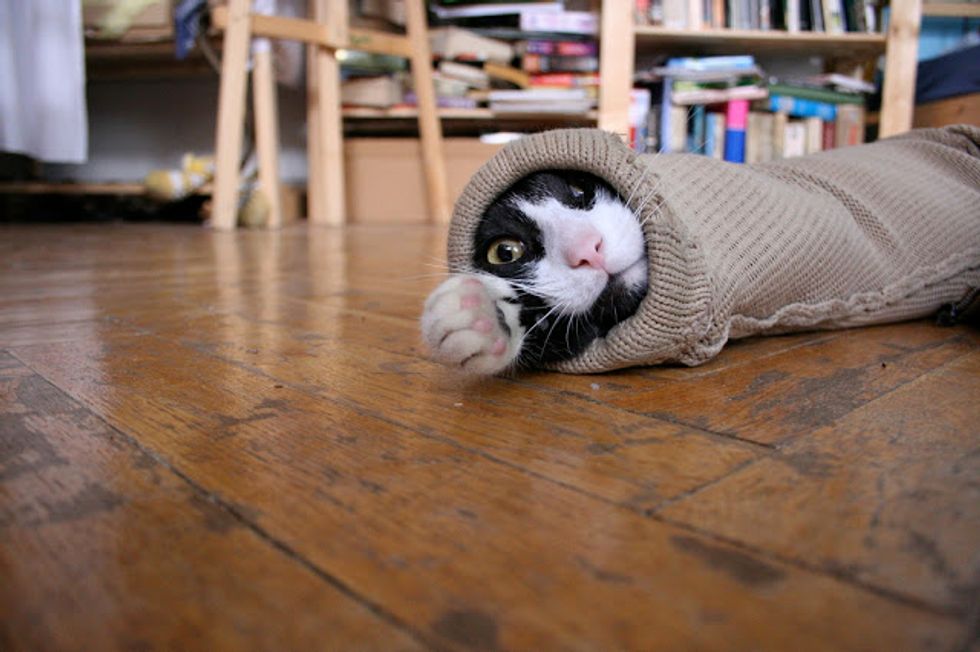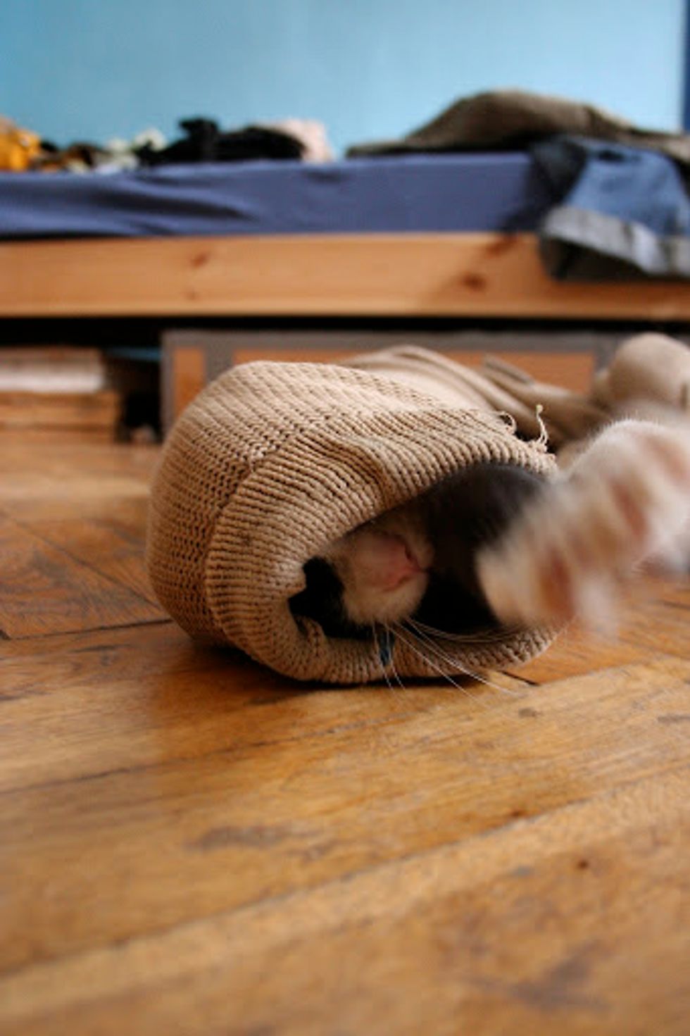 Cats often find the most unexpected places - between the couch cushions, small boxes, shoes, sleeves, pants, etc- to get into to cozy up or to play. Cats are curious, they love to hide and lurk - part of their predator instinct - and they love places that are squishy, cozy and snug.