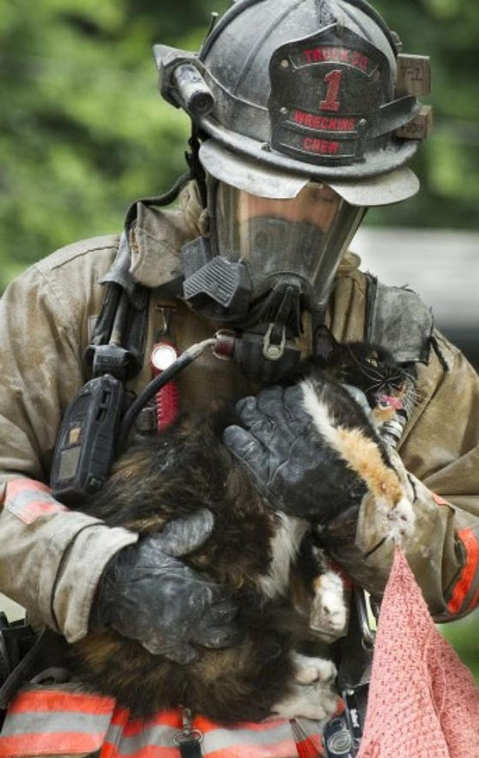 Kent Rinne who drove by the area stopped his car when he spotted smoke coming from the front window. When he learned that there were cats inside, he kicked in the door and crawled toward the fire to try to rescue the cats. He used the garden hose to keep the smoke in check until firefighters came about 90 seconds later.