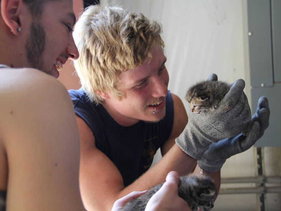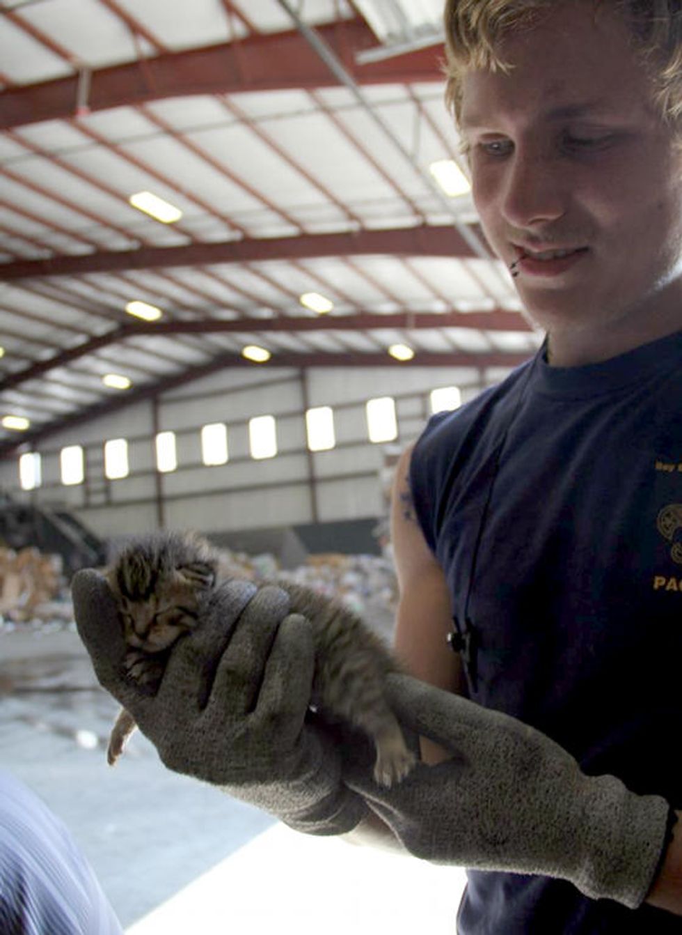Recycling center workers saved three tiny fur balls from a cardboard box that was on its way to the crusher
