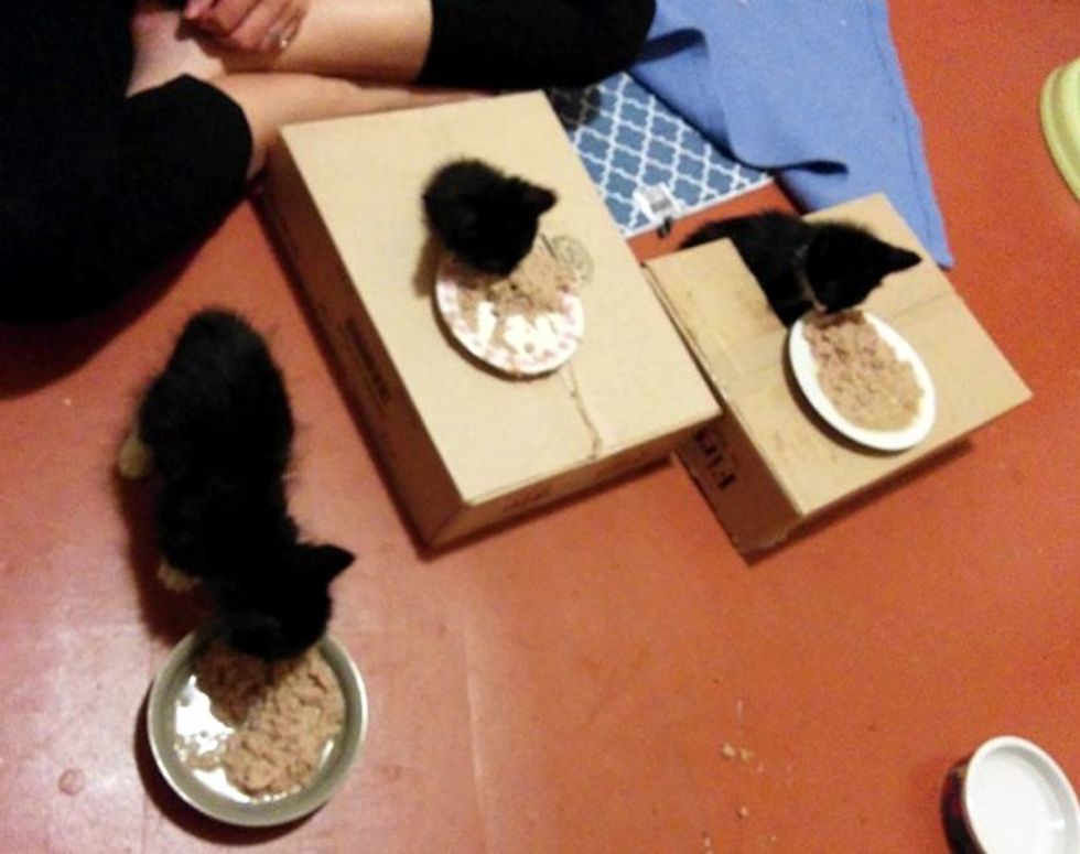 They invented a method to help the kitties eat. "At first they were very skeptical about eating off of a plate and insisted on being hand fed. One morning I was sitting with the kittens feeding them one at a time - and if you've ever heard a hungry kitten you'll know they aren't too patient about waiting their turn - and I knew that I had to come up with a way for them to eat all at once. I saw the empty cat food boxes sitting on the floor and decided to put them to good use as 'dining tables'."