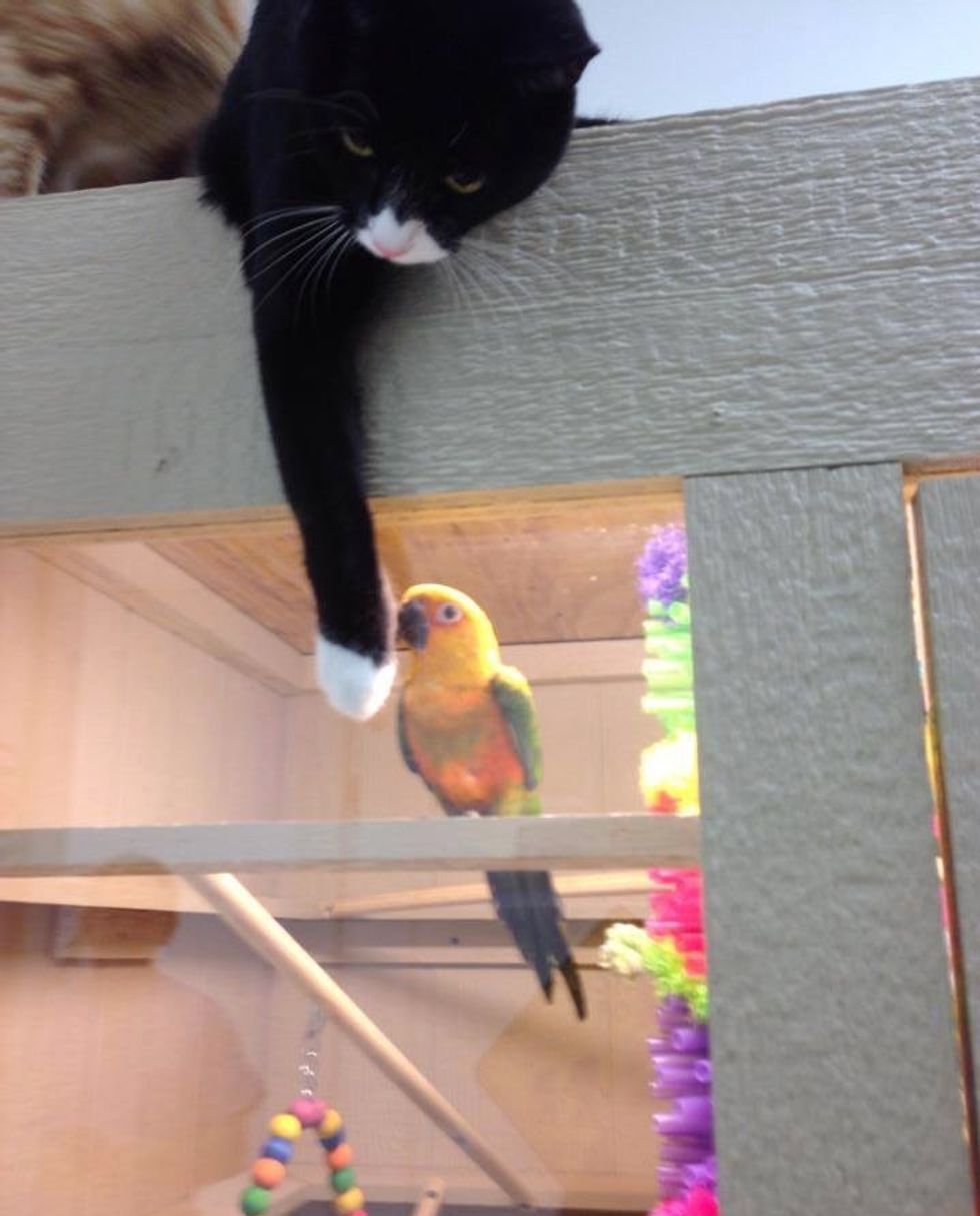 Buddy the parakeet checks out his new condo while Carl welcomes him to the neighborhood.