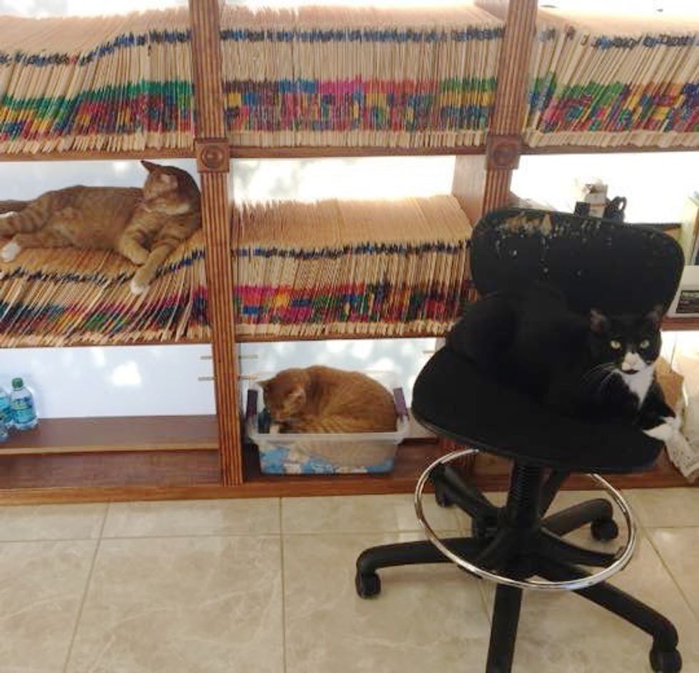 "She said if they were going to be office cats they needed office names, so she chose Larry, Roger, and Carl."