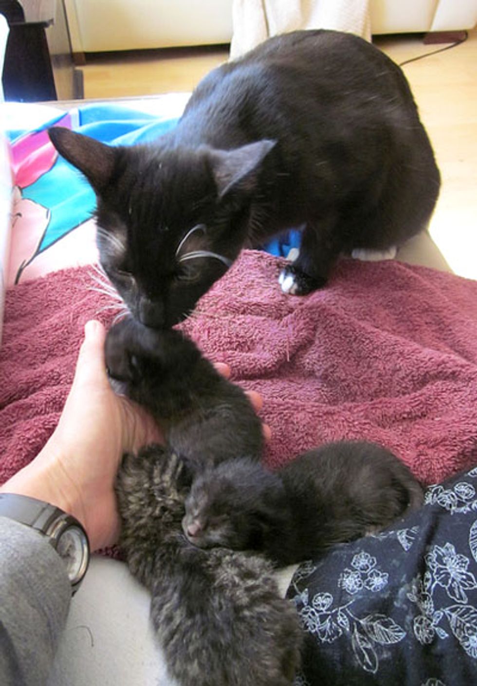 Pampi, one of the house cats took to the kittens right away. He helps Kimberly wash the babies after meal time and keep them soft and clean. "Pampi has really taken on his role of 'the mommy!' He likes to sit in their box waiting for me to give them back for him to bathe," says Kimberly.