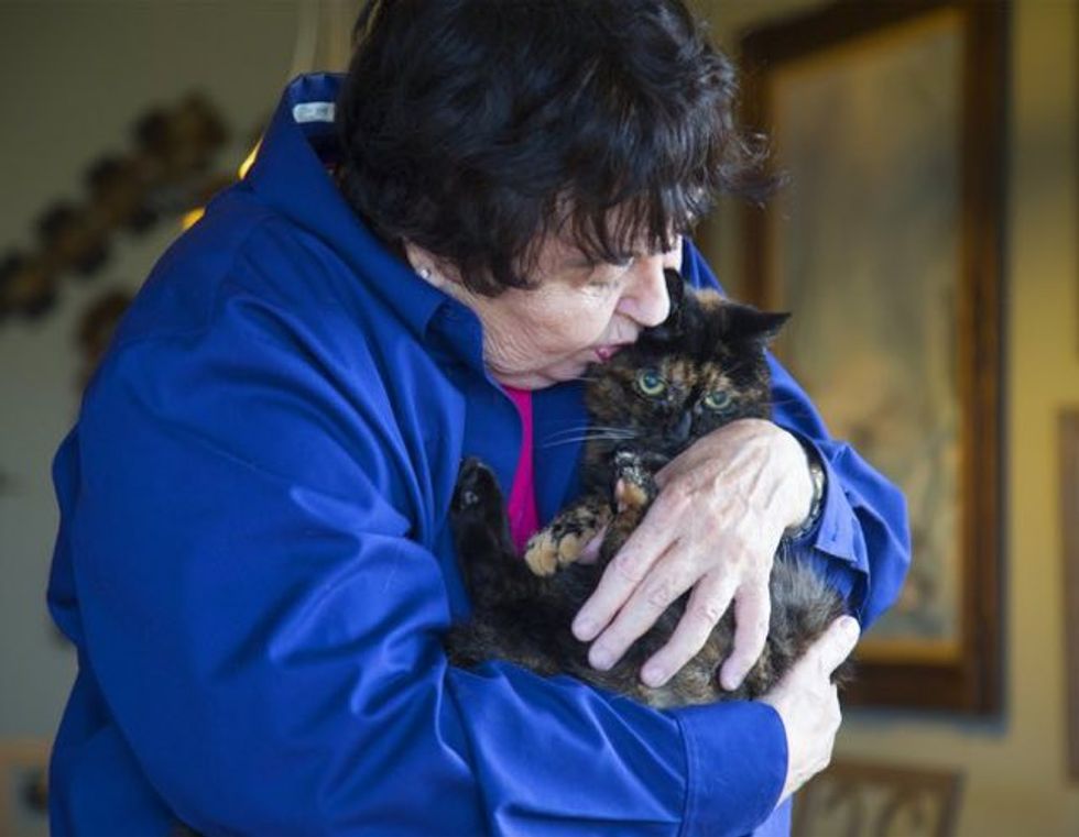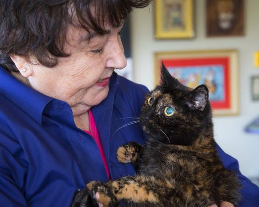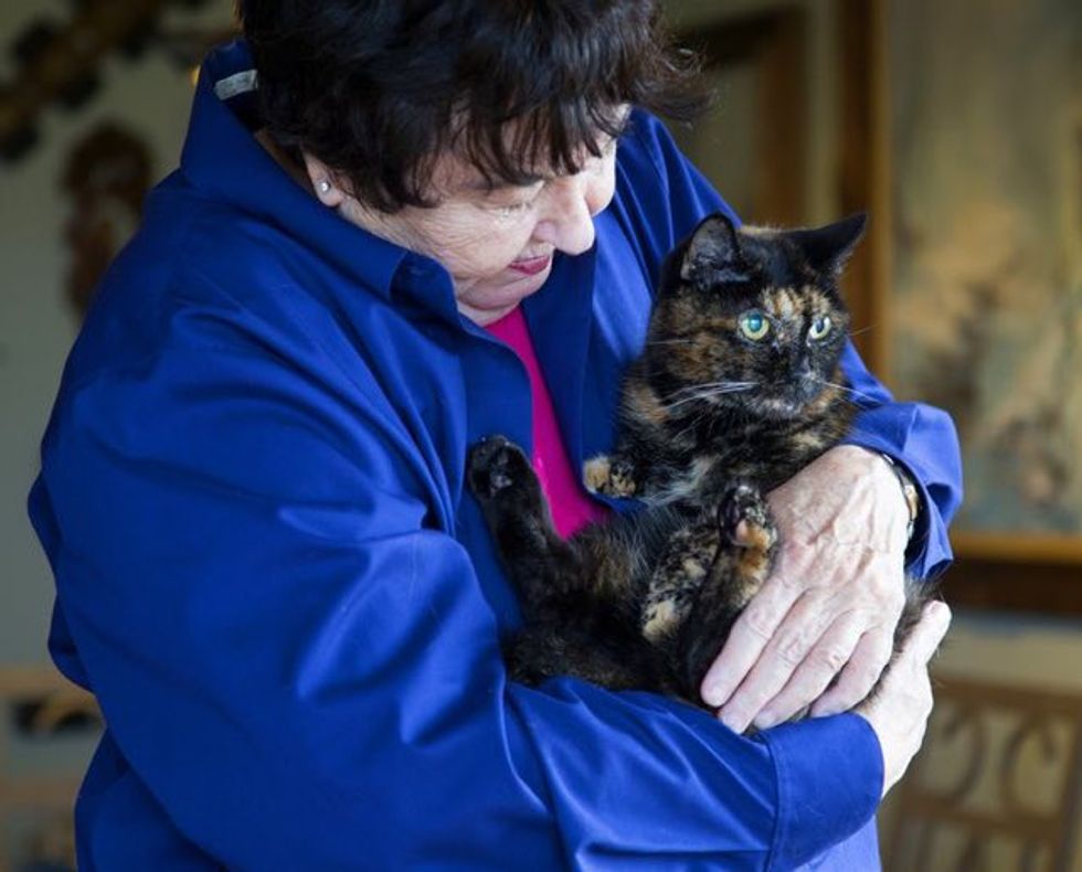 Tiffany Two met her human, Sharon Voorhees, when she was six weeks old. This lovely tortie girl outgrew two family dogs by some distance.