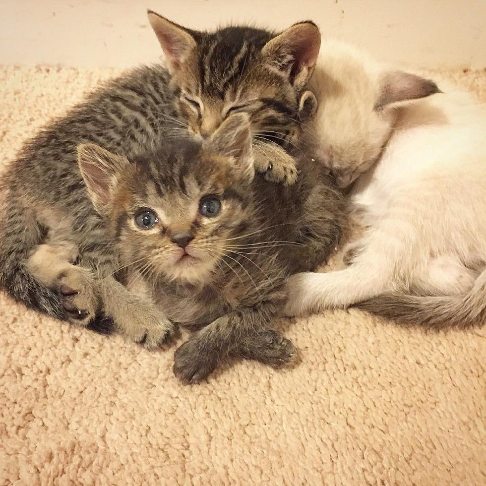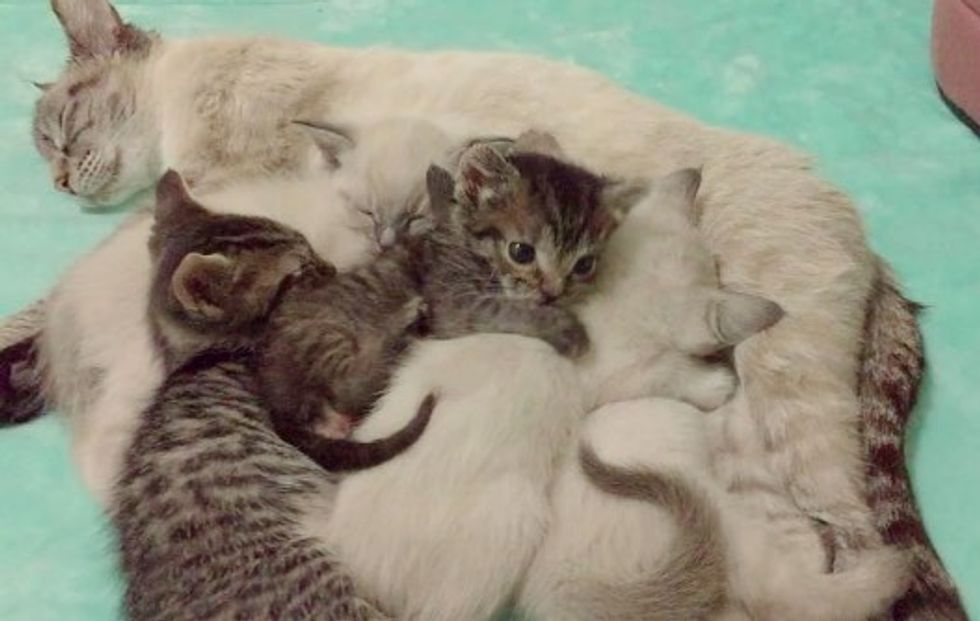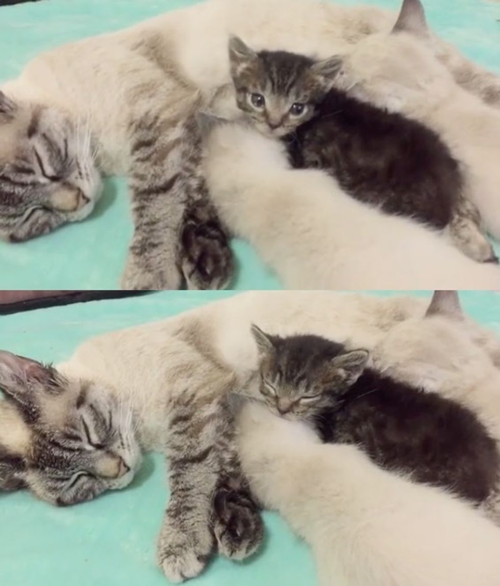 After a bottle of milk, he snuggled with mama and the other kittens for a nap. "He seems to love having a family," Cindy said.