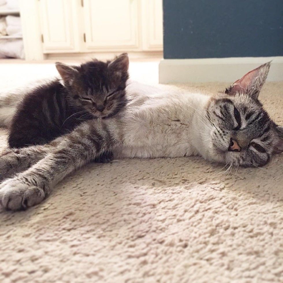 This orphaned kitten was the only survivor of his litter and never knew what it was like to have a mom until he found his surrogate mother.
