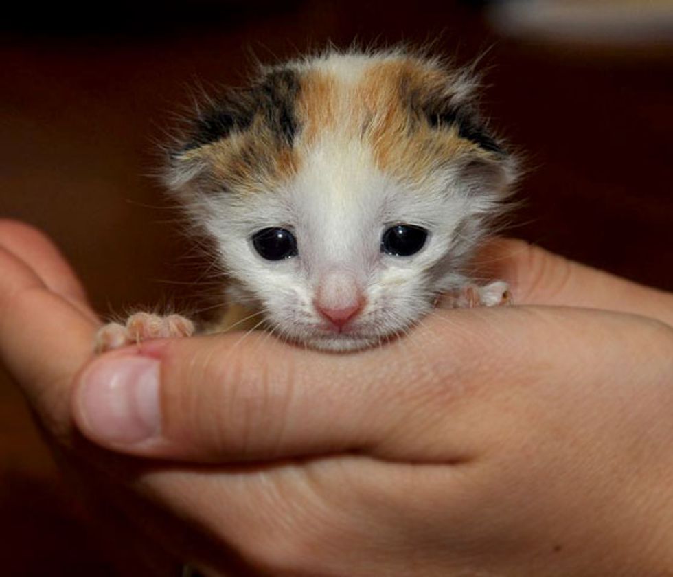 A tiny calico baby was found in a bush in a parking lot along with her 2 other siblings. She and one other kitty pulled through the night and have been nursed back to health. The little kitty is being cared for by Molly who works round the clock. Once they are big enough, they will be ready for their forever loving homes.
