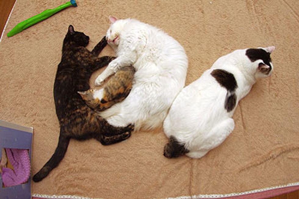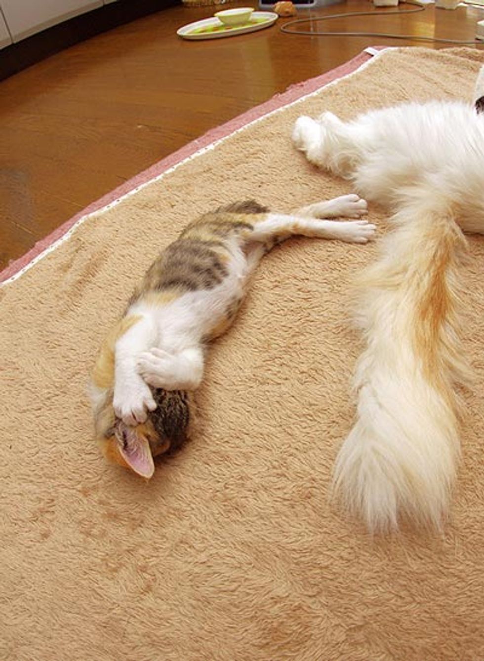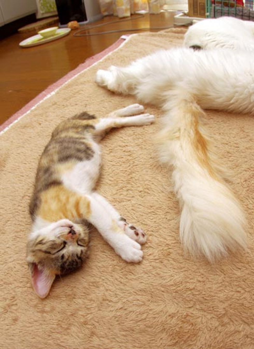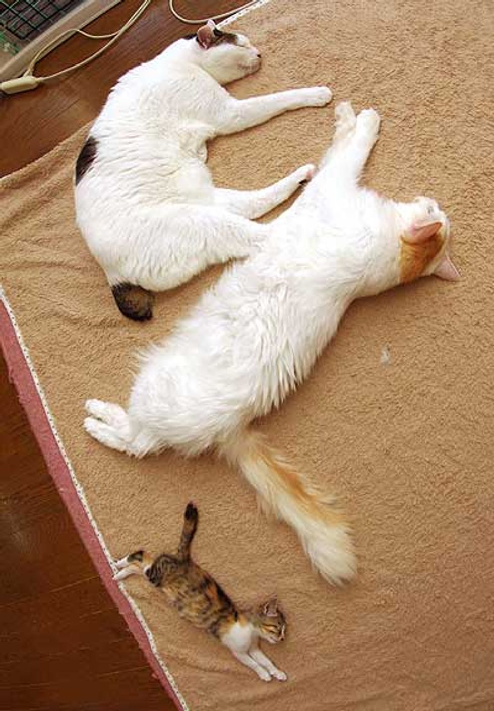 Castella, the teeny calico found inside a wall, has grown to tail length. 30cm to be exact according to her hooman. Her favorite pastime is to laze around the house with her older kitty friends.