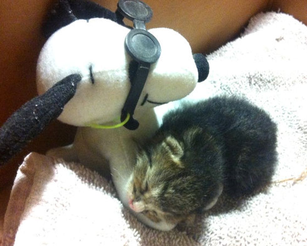 After filling the belly, kitty is finally happy and sleepy... snoozing with Snoopy.
