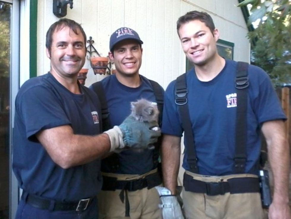 "Curiosity could have killed this kitten but for the wonderful guys from Fire Station 2. They are from left to right: Fire Apparatus Operator Manny Souza, Firefighter Joe Van Walraven and Captain Sean Holbrook."