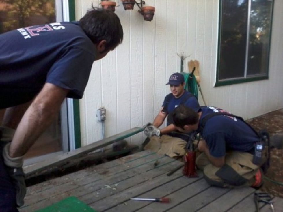 "This little girl somehow got her head caught in an open cable hole in my deck on Tuesday September 2nd. The wonderful firefighters of Sparks Nevada Fire Station 2 spent over an hour to get her out including having to pry up part of my deck in order to safely cut her out."
