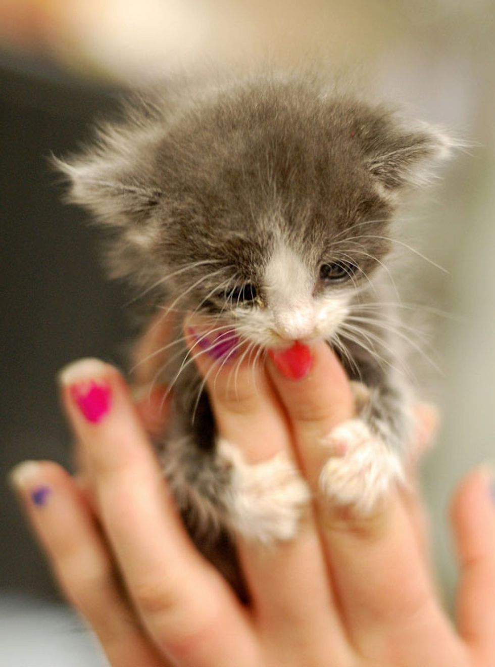"She came into the shelter all by her lonesome and she's being fostered by Katherine, the foster care coordinator. Katherine has a mama cat in her care too, and when Mama heard Kisses crying, she offered her a little of her milk," said Laurie from Itty Bitty Kitty Committee.