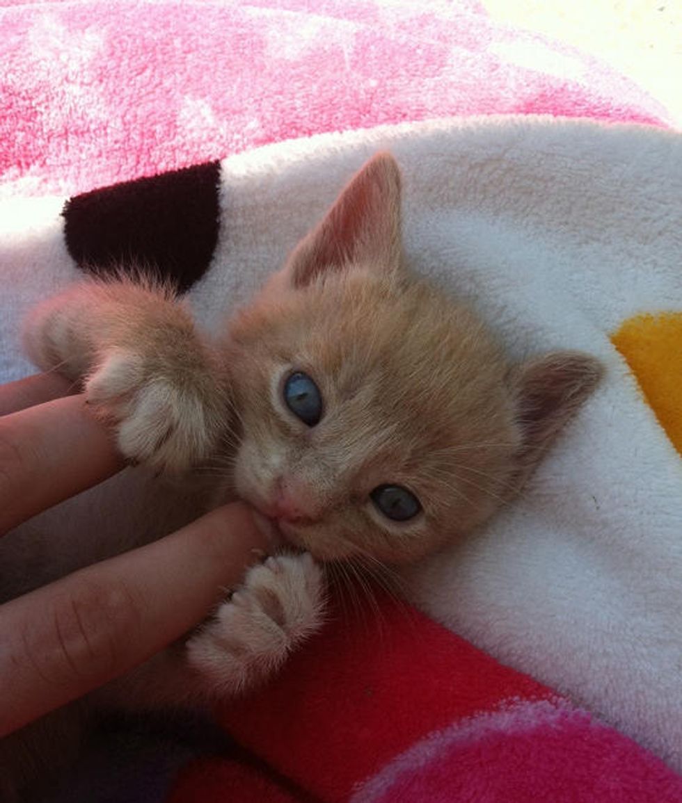Rajah the kitten and his new human at his loving home