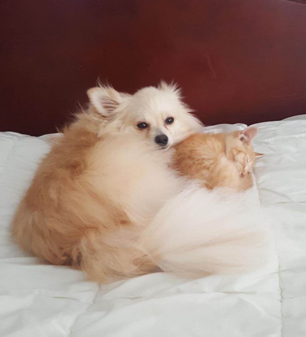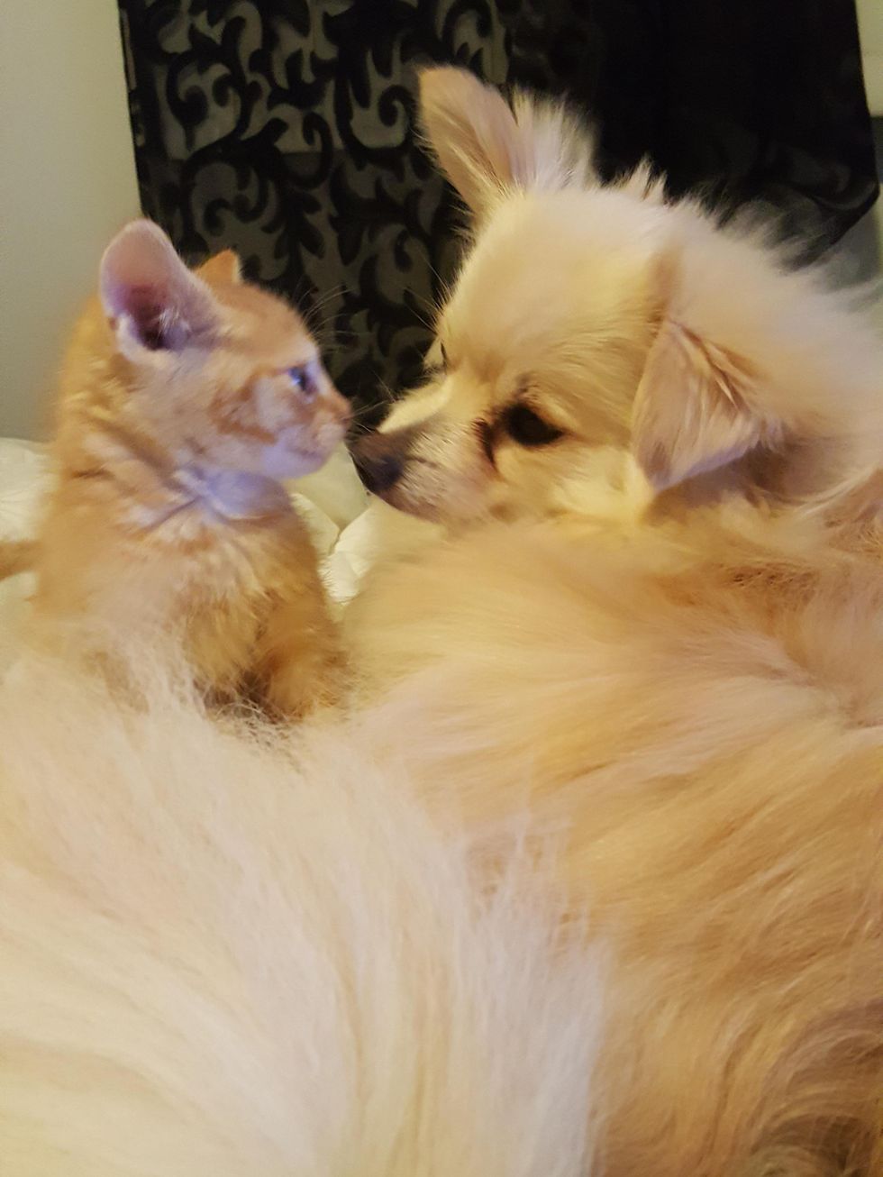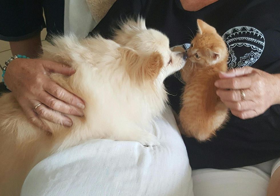 When they introduced him to their family dog Okami the sweet Pomeranian, he immediately took to the kitten and wanted to look after him.