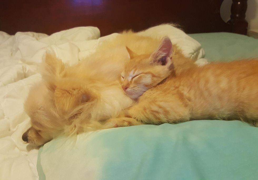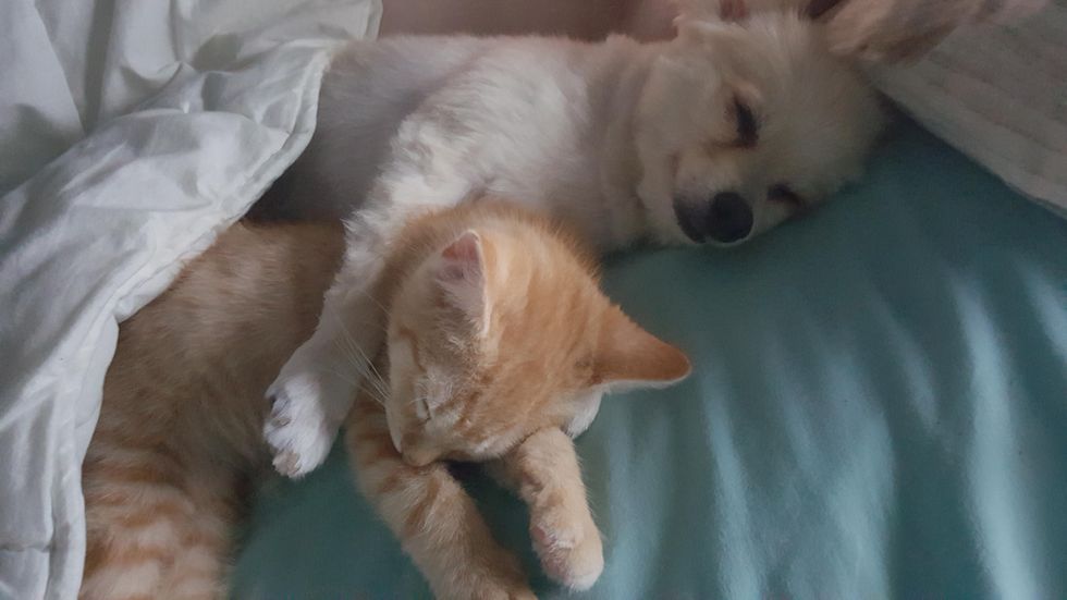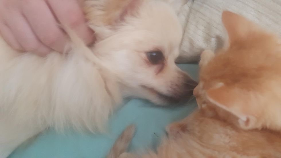 A tiny ginger kitten was adopted by a small dog who took him under his wing on the day they met.