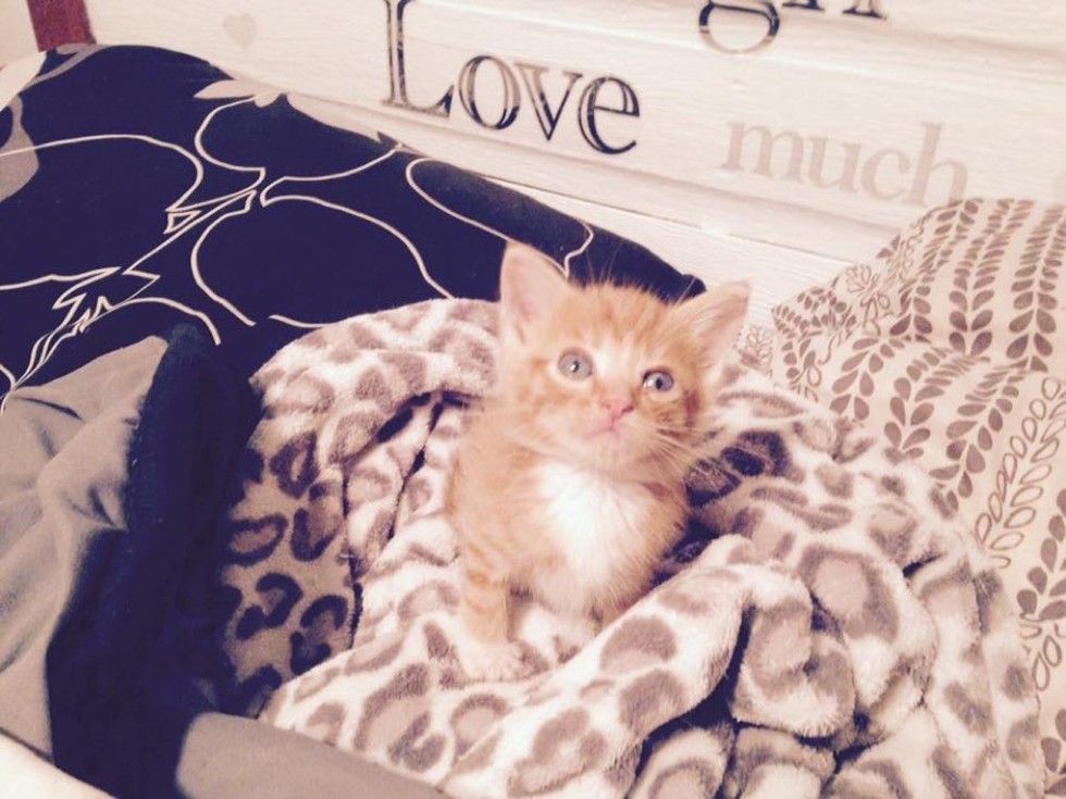 A tiny ginger kitten was left behind at the farm after he was born. His mama cat didn't think he was going to survive, but a woman knew there was hope and drove 10 miles to save his life despite tornado warnings.