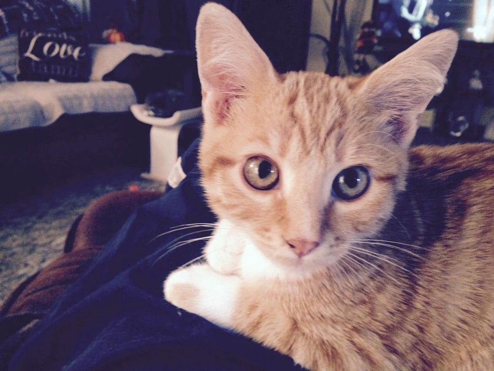 "I came home on lunches to give him kitten formula mixed with wet food for two weeks. He stood on the plate and has been spoiled ever since."