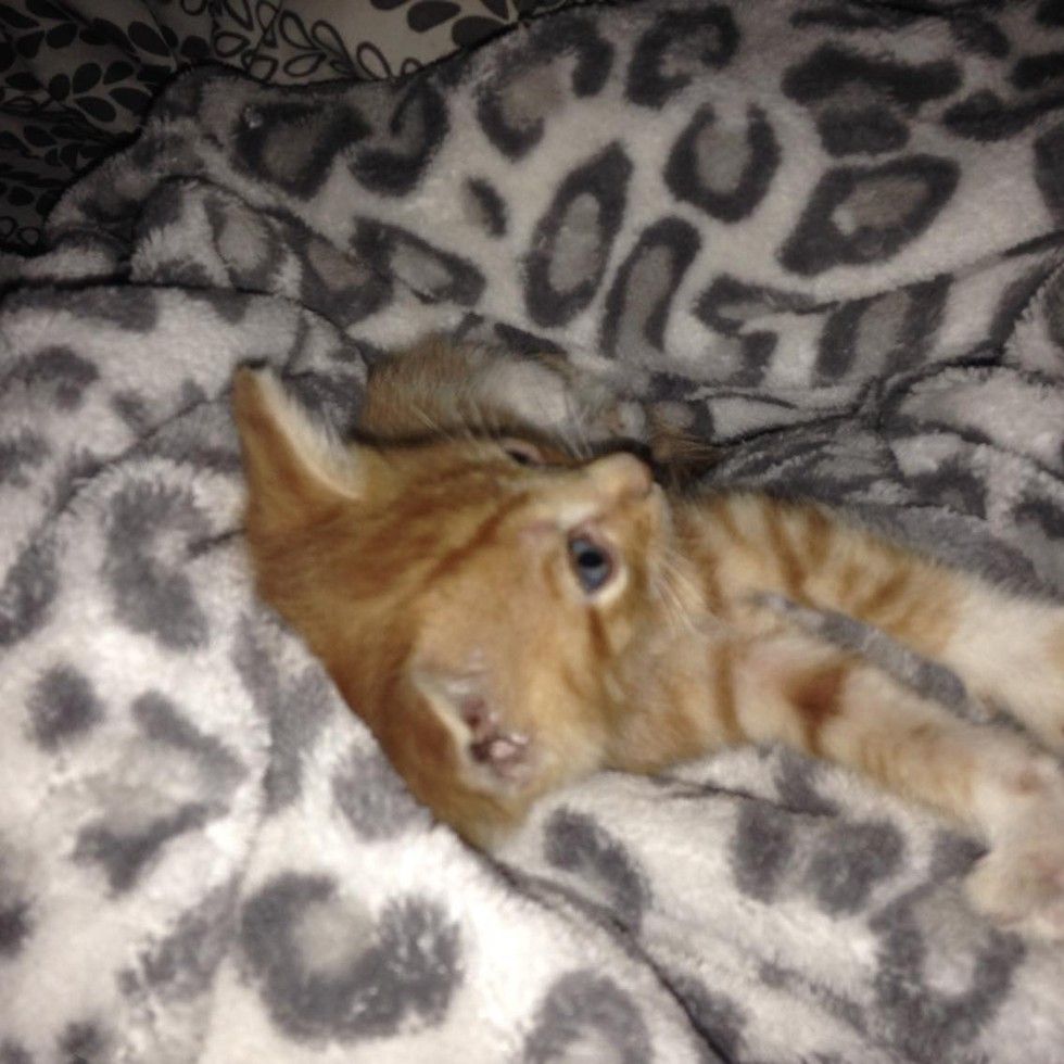 When Picek got him home, she laid him down on a chair wrapped up in a blanket and fed him kitten formula through a syringe. The around the clock care began.